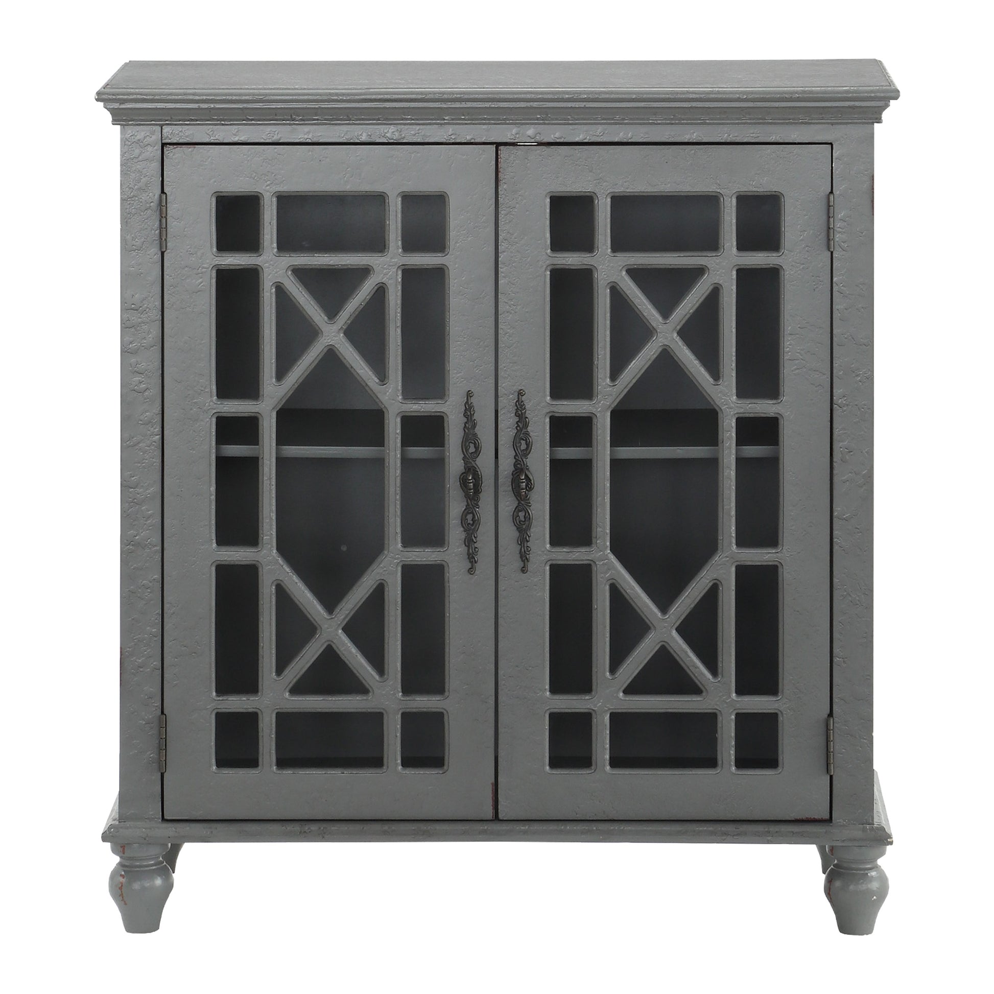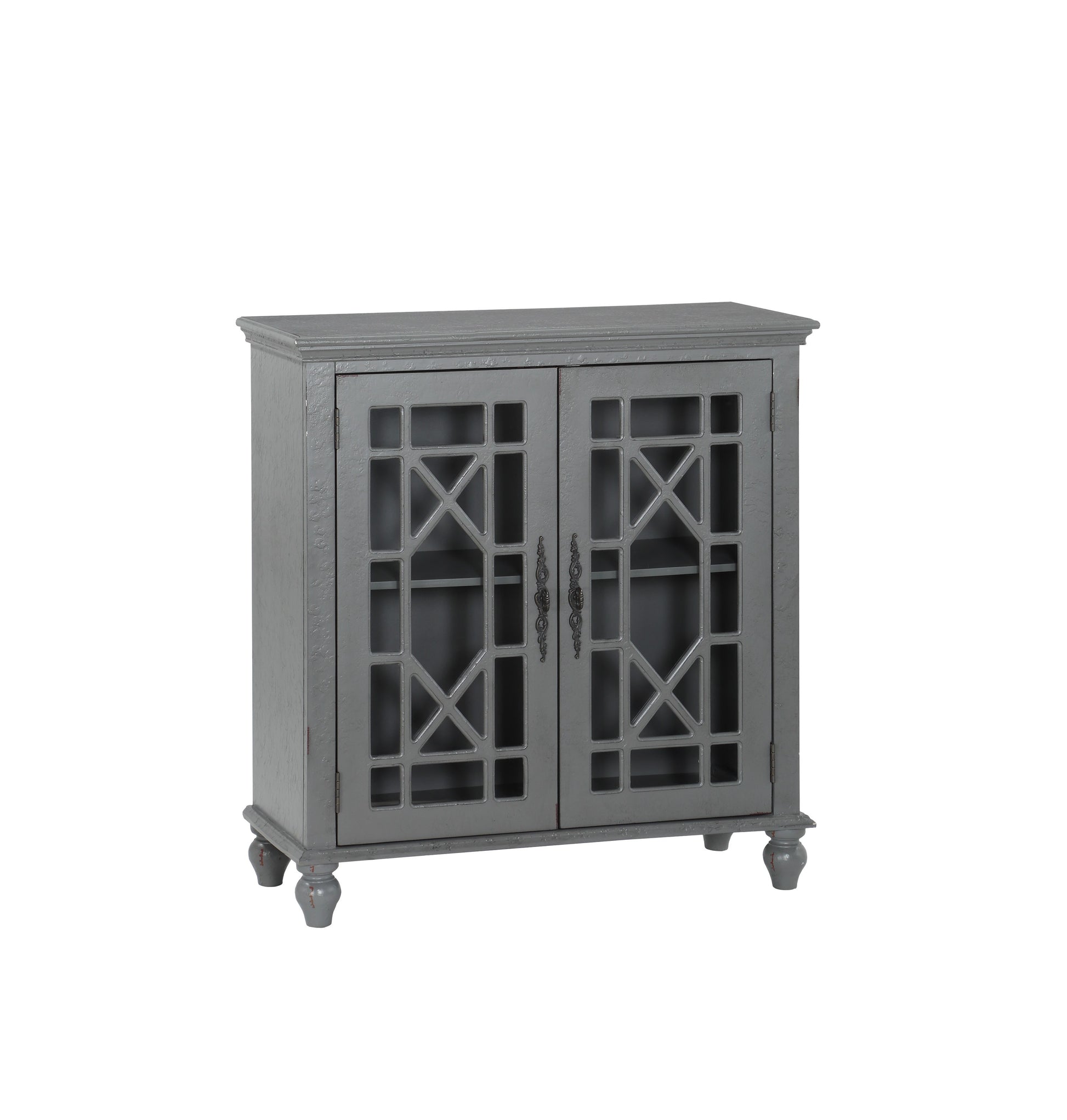 The addition of functional storage space to any home is always welcome. The Eliza Collection provides classic accent to your home’s décor while meeting your storage needs. The modern traditional design of the cabinet features behind door shelving, turned support feet, gray finish, interwoven decorative mixed media glass and wood doors, and antiqued brass hardware. Also available in black and white finish.