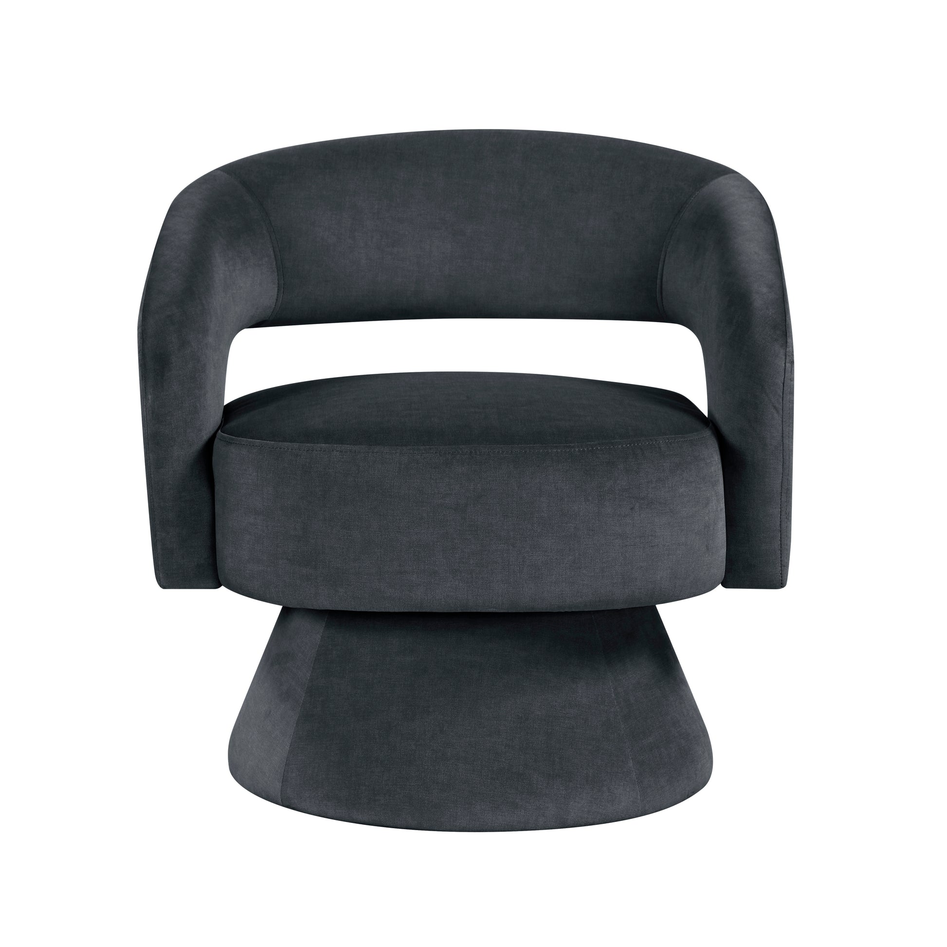 Add a touch of modern elegance and versatile functionality to your living space with this contemporary swivel barrel chair. Featuring a sleek, rounded silhouette and luxurious plush velvet upholstery in a sophisticated dark gray, this chair effortlessly blends style and comfort. The smooth 360-degree swivel base allows for easy movement and conversation, making it a perfect addition to living rooms, bedrooms, offices, or reading nooks. The generously cushioned seat and back provide exceptional comfort, inviting you to relax and unwind. This chair is designed to be a statement piece, offering both aesthetic appeal and practical functionality to any modern home.
