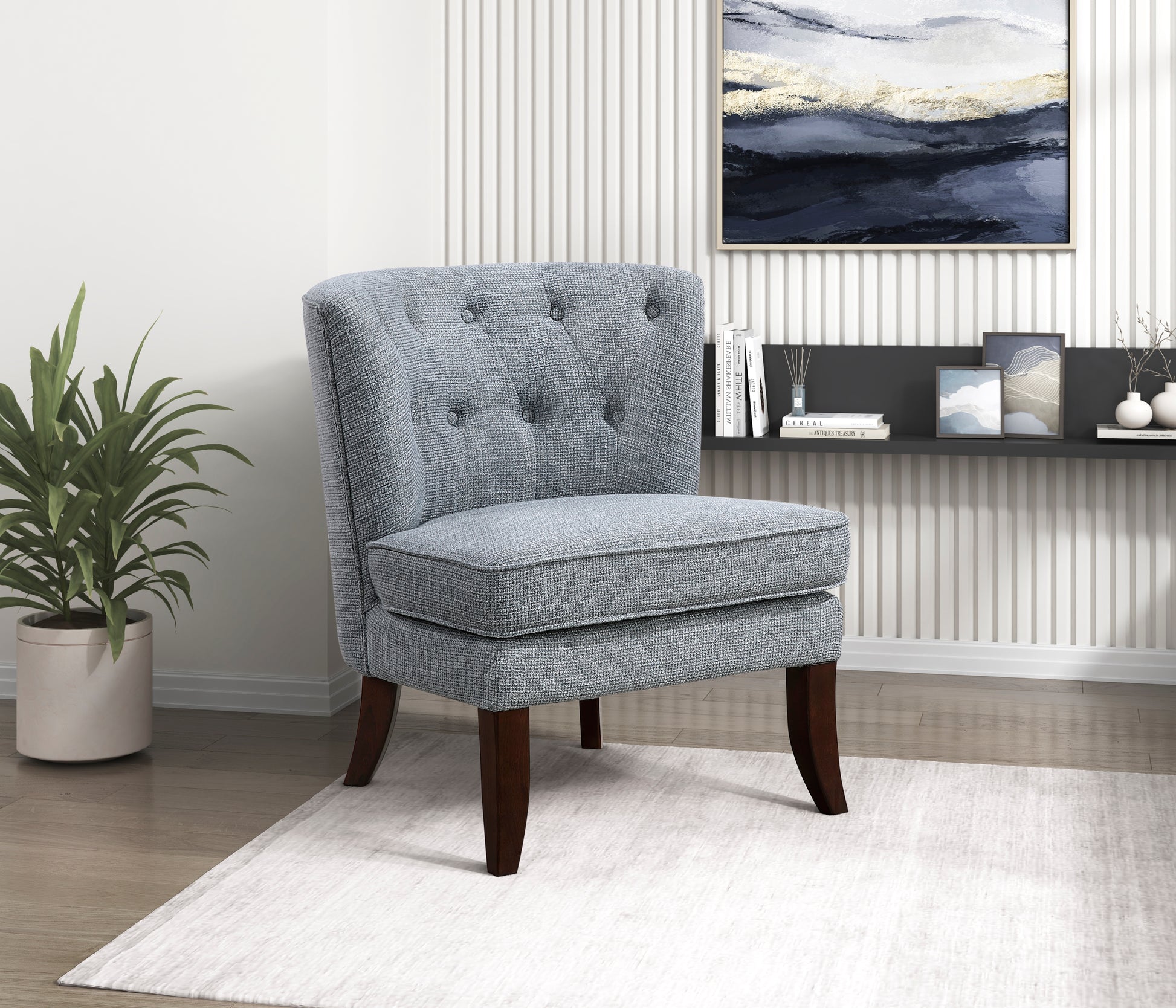 Add a touch of classic elegance to your home with this beautifully tufted accent chair. Featuring a traditional silhouette and delicate button tufting, this chair exudes sophistication and charm. The soft, textured dark gray fabric upholstery complements a variety of interior styles, while the generously cushioned seat provides exceptional comfort. Sturdy dark wood legs add a touch of contrast and stability, making this chair a perfect addition to your living room, bedroom, entryway, or dining area. Enhance your space with this versatile and stylish accent piece that seamlessly blends timeless design with modern comfort.