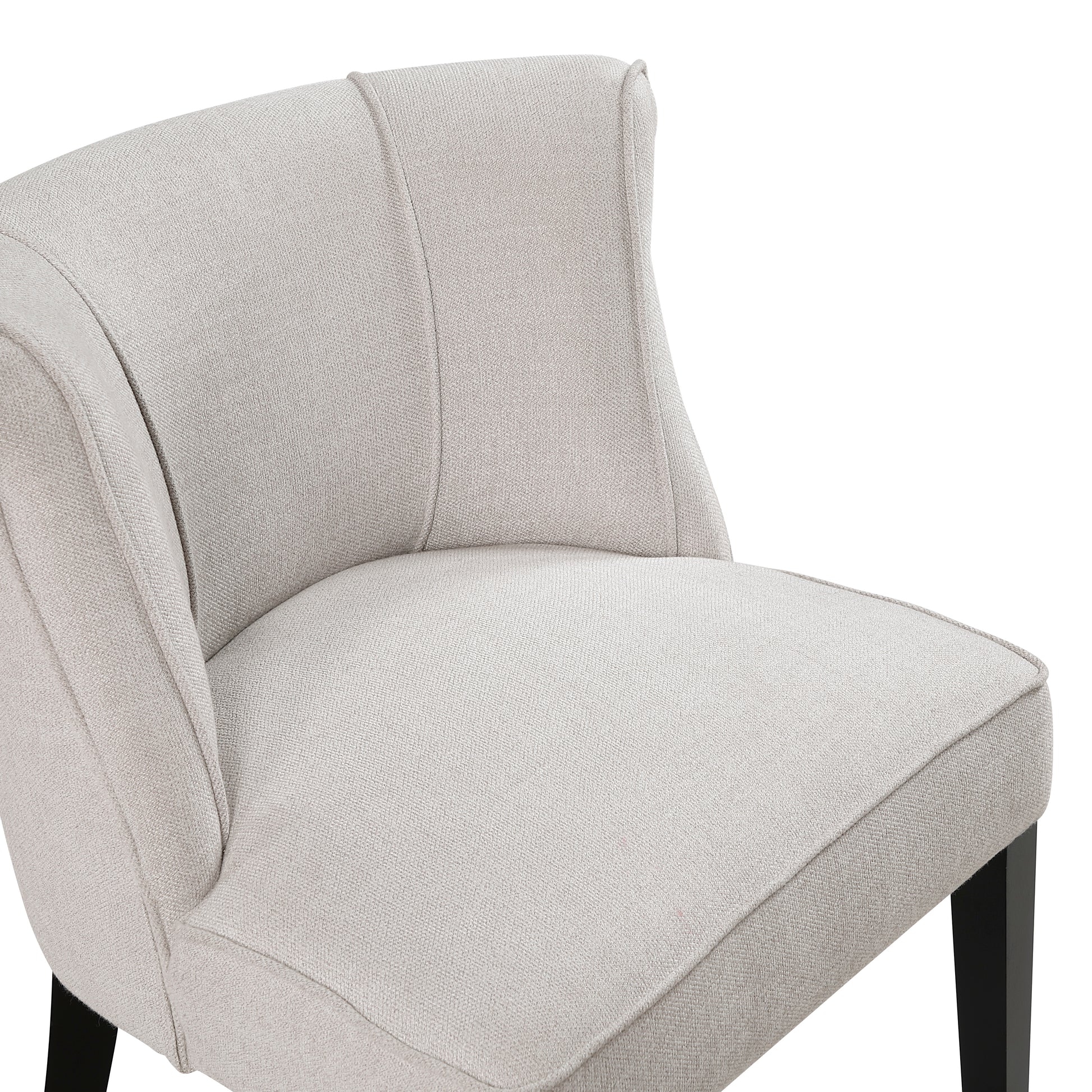 Elevate your home décor with this sophisticated upholstered accent chair, designed to provide both comfort and style. Featuring a gracefully curved back with subtle piping detail, this chair adds a touch of classic elegance to any room. The neutral-toned, textured fabric upholstery complements a variety of interior styles, while the generously padded seat ensures comfortable seating. Sturdy dark wood legs provide a stable and stylish foundation, making this accent chair a perfect addition to your living room, bedroom, dining area, or entryway. Enhance your space with this versatile and chic accent piece that seamlessly blends functionality with refined design.