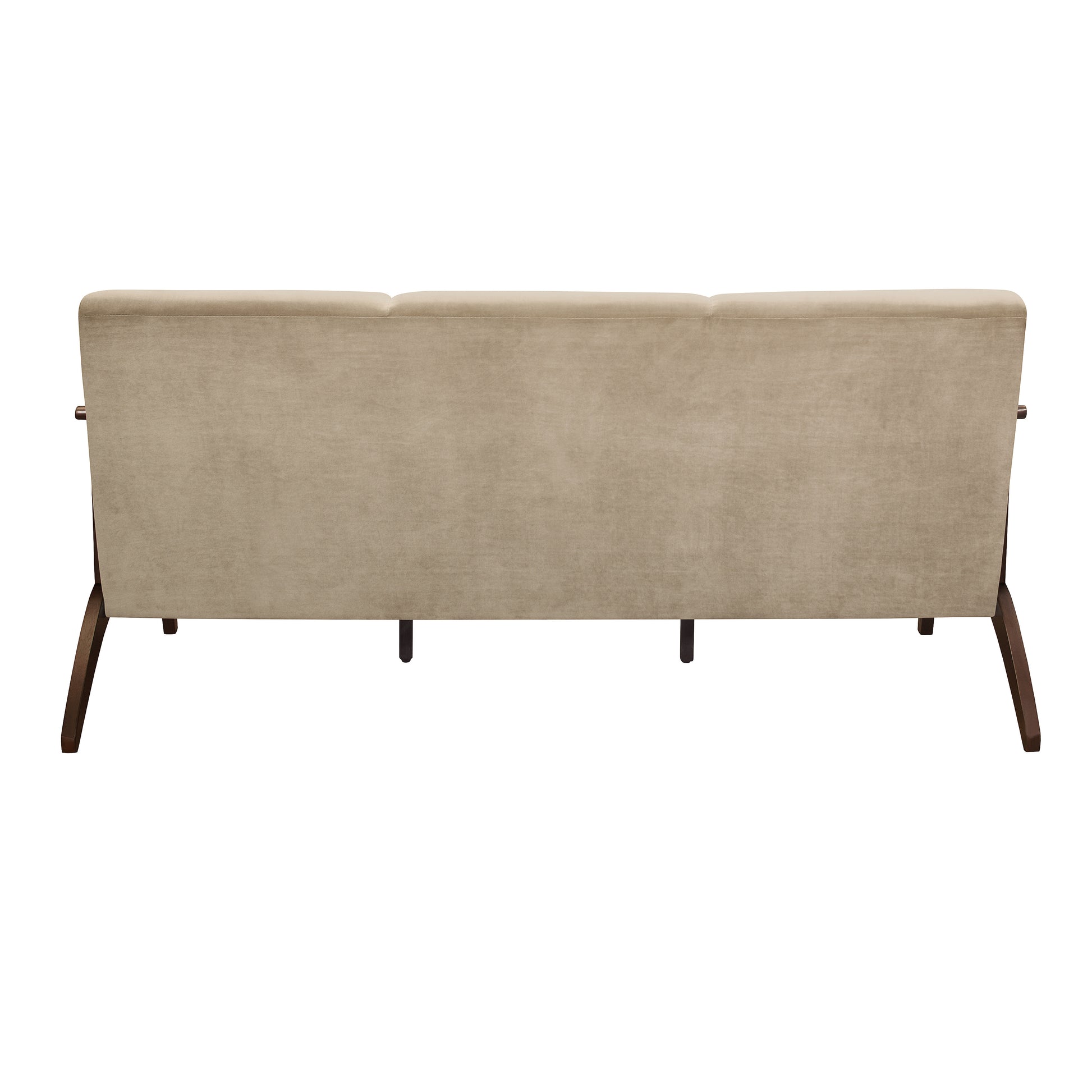 The frame of the Carlson Collection recalls a time when simplicity of profile was the height of style. The streamlined design of the subtly sloped wood arms and legs is finished in dark walnut which serves to highlight the light brown velvet covering.