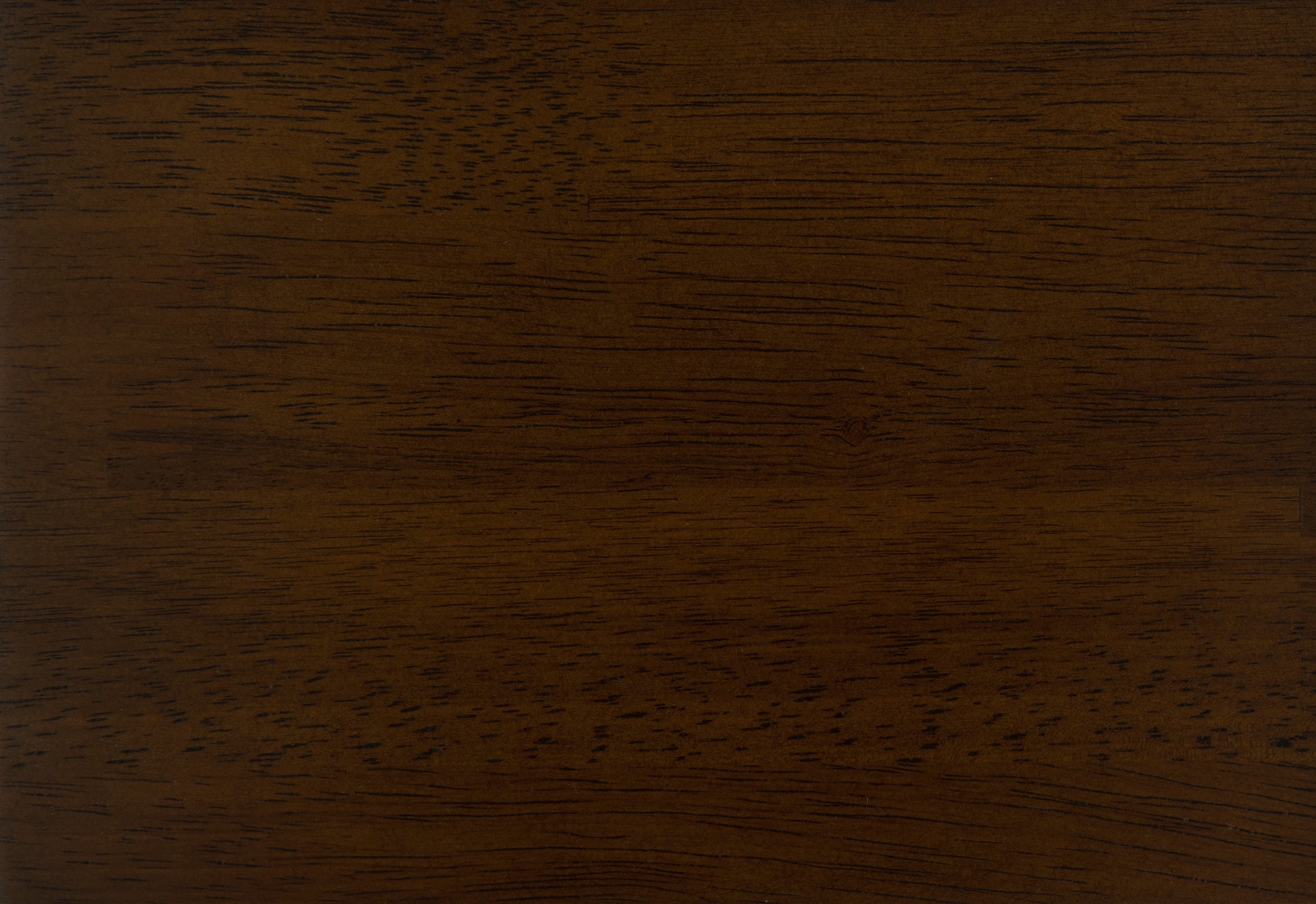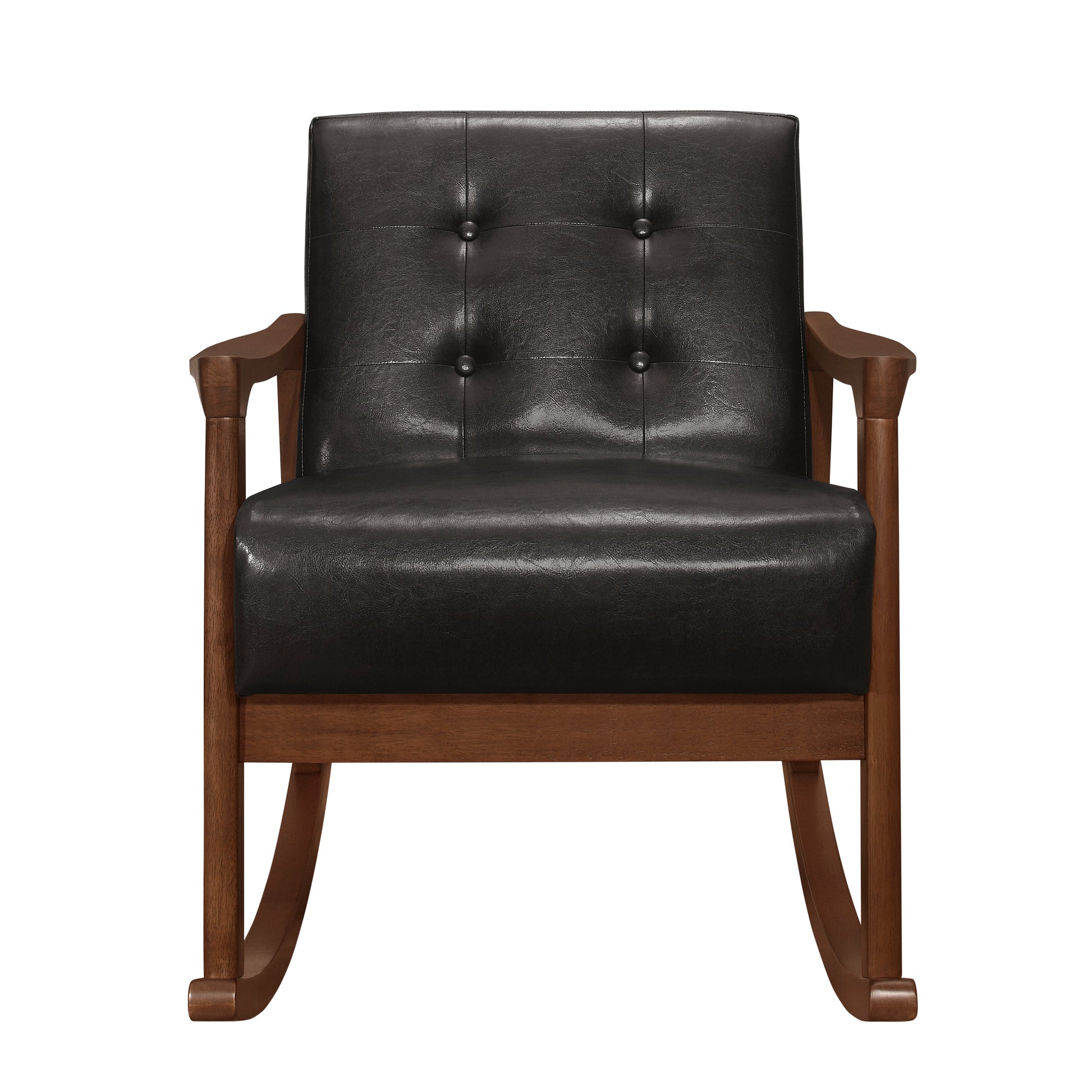 Mid-Century Modern lines define the profile of the Auden Collection rocking chair. Contoured arms top the framing of the rocker rails. The button-tufted back and plain seat of the chair are covered in dark brown faux leather upholstery, with walnut finish over solid wood.