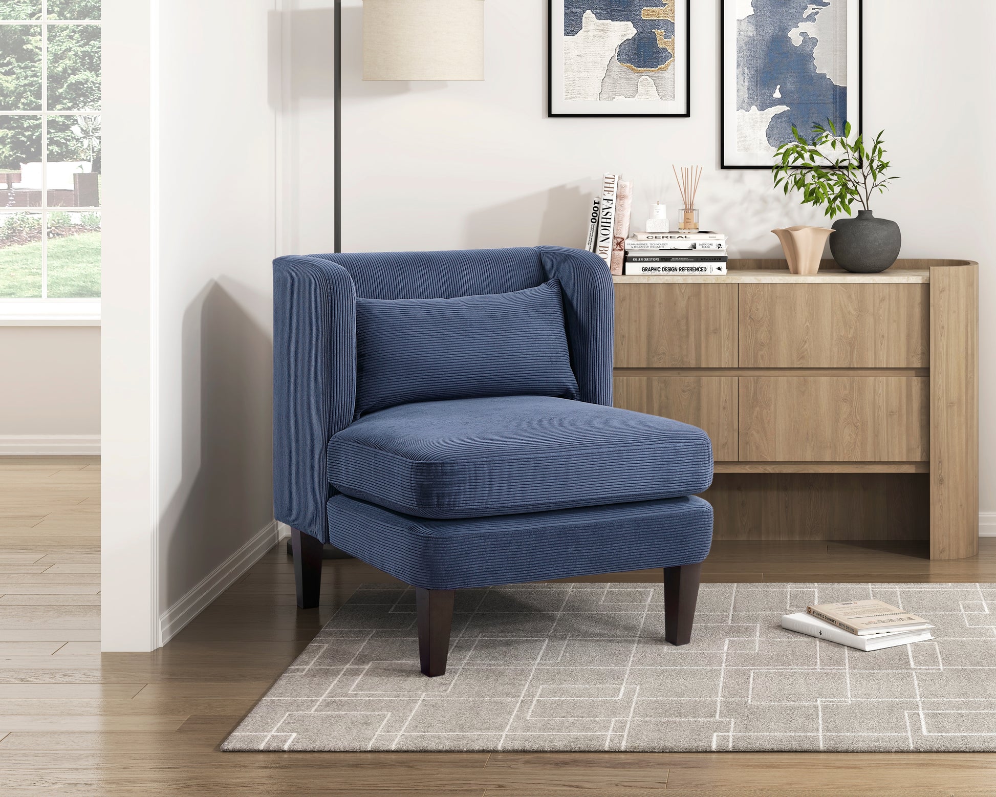 Add a touch of contemporary sophistication and comfort to your home with this modern accent chair featuring a unique channeled fabric upholstery. The chair showcases a clean, geometric silhouette with a distinctive wave-like pattern, bringing a fresh and stylish feel to any room. The soft blue fabric upholstery complements a variety of interior styles, while the generously cushioned seat and included lumbar pillow provide exceptional comfort and support. Sturdy dark wood legs add a touch of contrast and stability, making this chair a perfect addition to your living room, bedroom, reading nook, or office. Enhance your space with this versatile and chic accent piece that seamlessly blends modern design with ultimate relaxation.