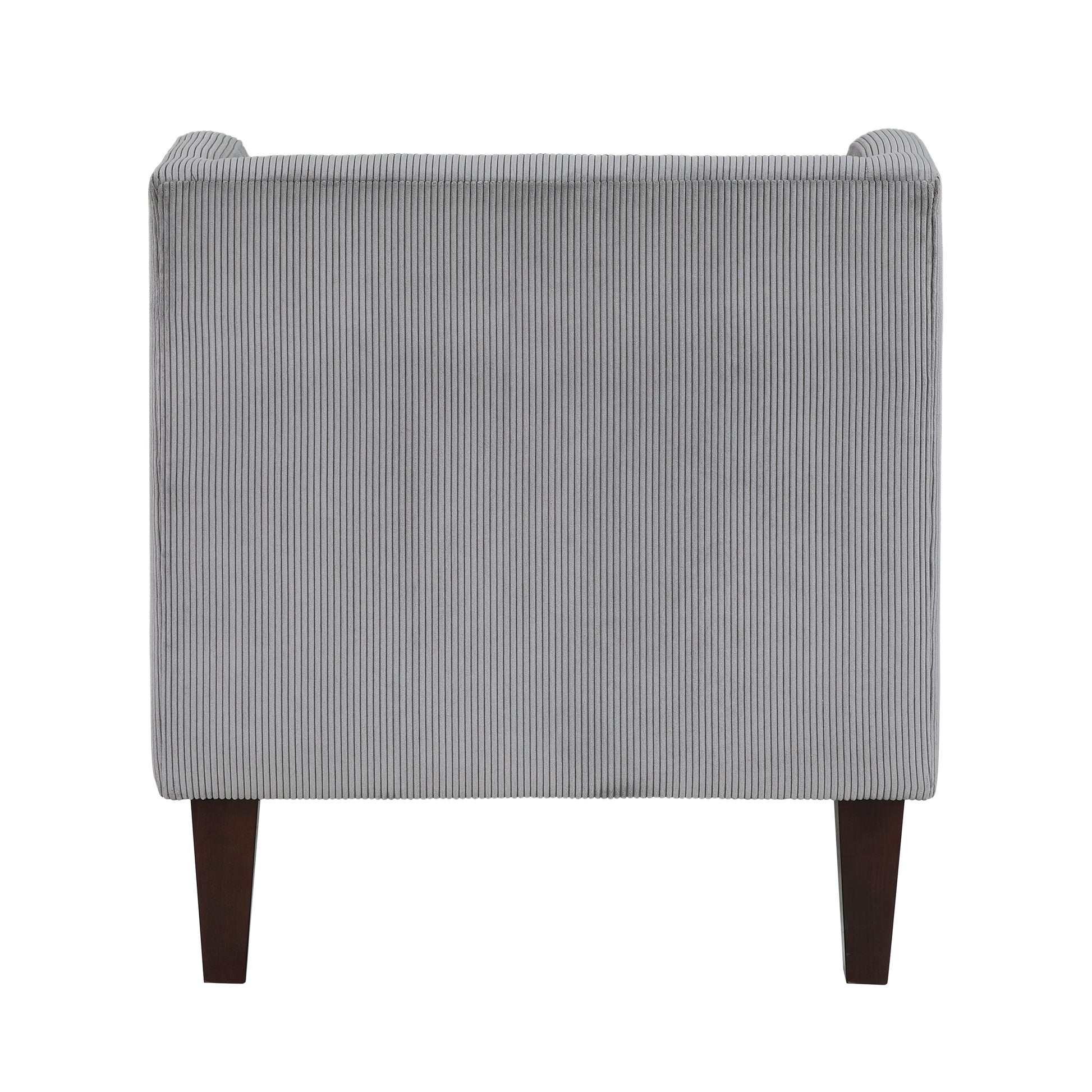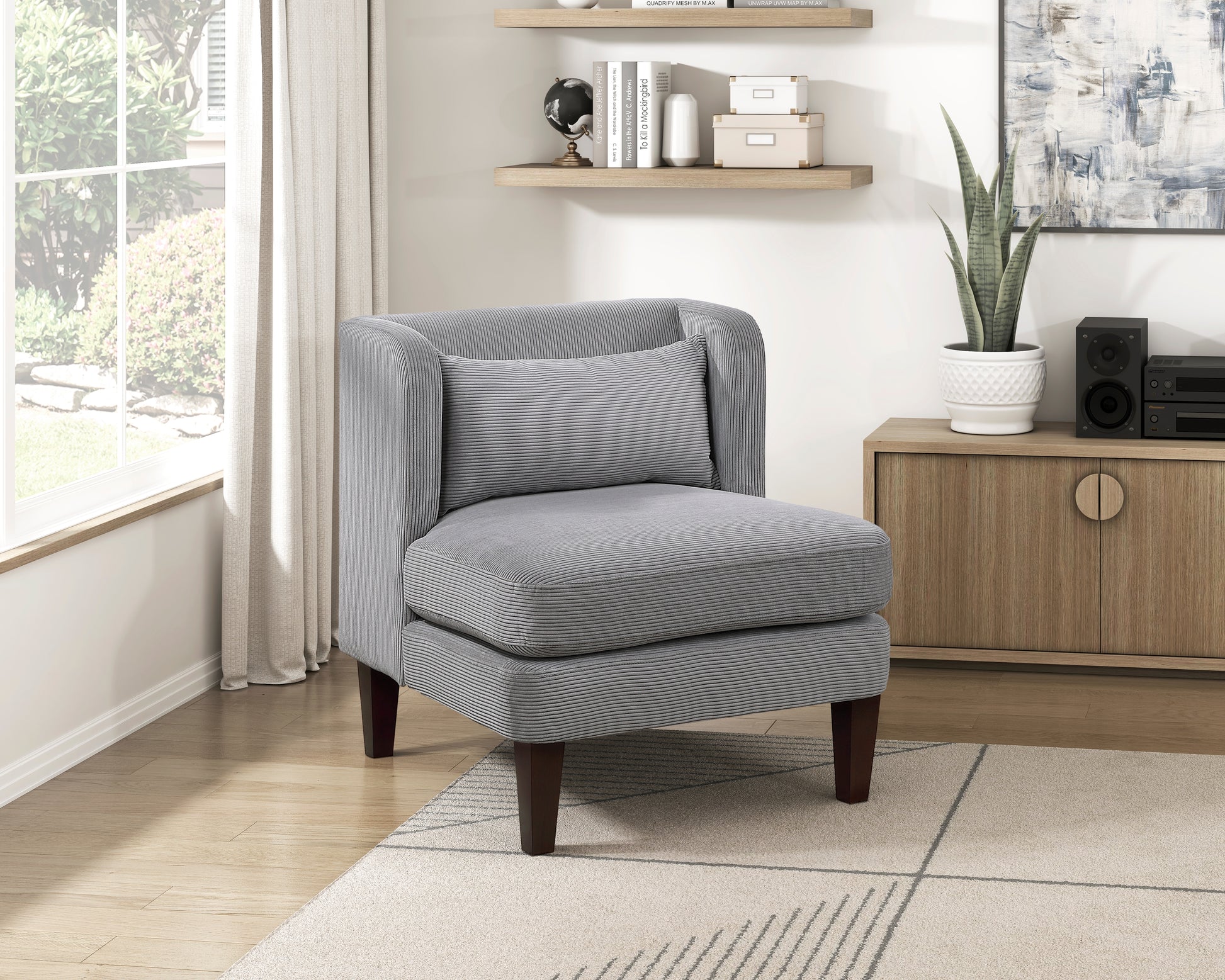Add a touch of contemporary sophistication and comfort to your home with this modern accent chair featuring a unique channeled fabric upholstery. The chair showcases a clean, geometric silhouette with a distinctive wave-like pattern, bringing a fresh and stylish feel to any room. The soft dark gray fabric upholstery complements a variety of interior styles, while the generously cushioned seat and included lumbar pillow provide exceptional comfort and support. Sturdy dark wood legs add a touch of contrast and stability, making this chair a perfect addition to your living room, bedroom, reading nook, or office. Enhance your space with this versatile and chic accent piece that seamlessly blends modern design with ultimate relaxation.
