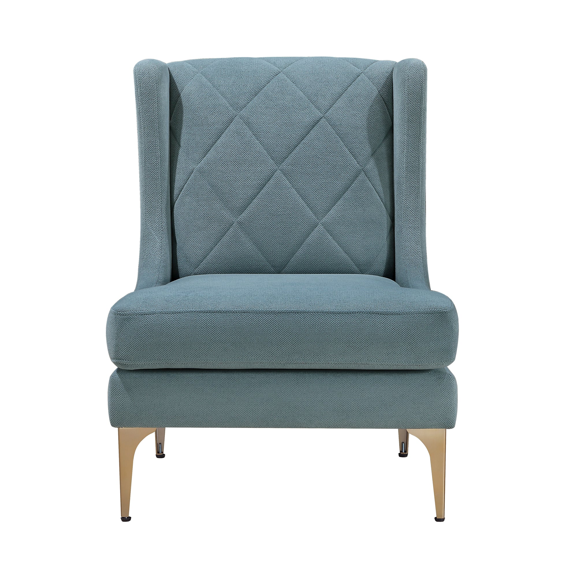 Add a touch of contemporary elegance and exceptional comfort to your living space with this blue chenille accent chair. Featuring a sturdy plywood frame, foam padding over pocket coils, and soft chenille fabric upholstery, this chair offers both durability and a luxurious seating experience. The diamond-stitched chair back adds a touch of modern sophistication, while the reversible seat cushion and removable cover make maintenance a breeze. The brushed gold finish metal legs provide a stylish foundation. With a 300lb weight capacity and easy assembly, this armchair is perfect for enhancing your living room, bedroom, or reading nook with a blend of style and practicality.