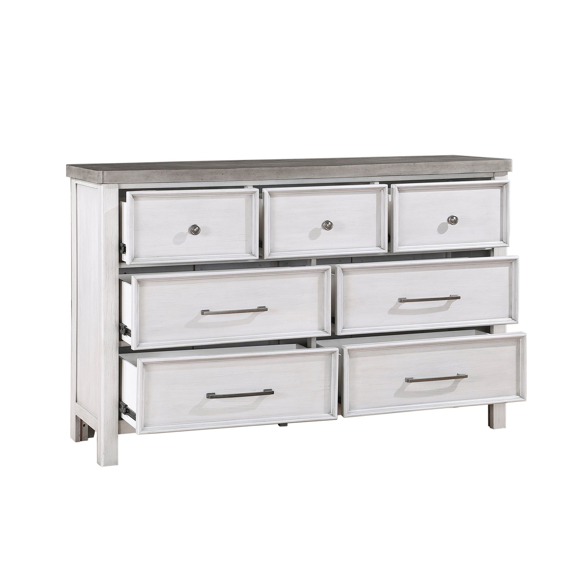 Hints of rustic styling permeate the transitional design of the Ambrose Collection, each subtle accent building to create a classic look for your bedroom. Antique White and Antique Gray finishes highlight the acacia veneer, their hues providing perfect complement to each other. The bar and knob hardware that fronts the drawers of the dresser are finished in antique pewter.