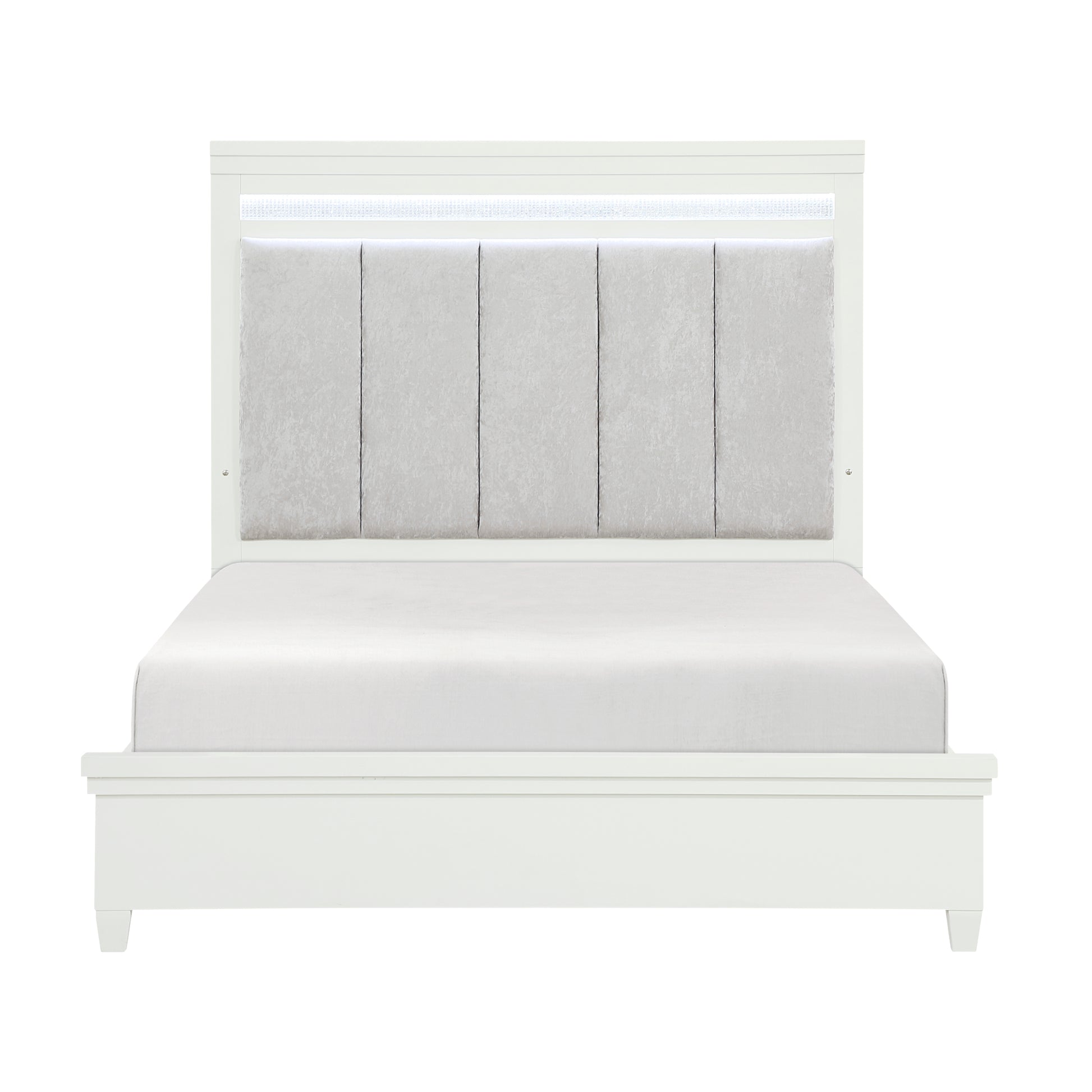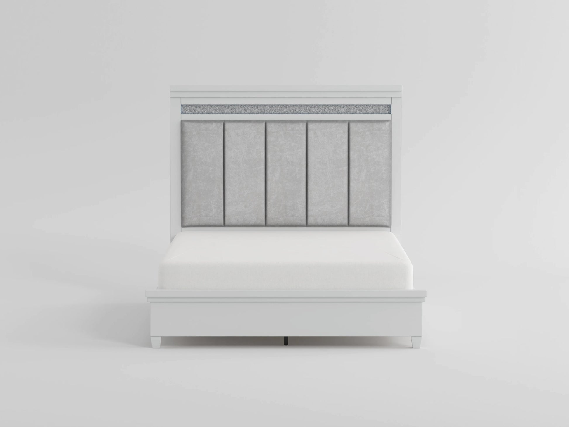 Elegance is beautifully captured in the design of the Kidman Collection. Gray velvet fabric upholstery covers the panel headboard, with LED backlighting providing dramatic illumination to the collection’s design. Inset faux crystal banding provides accent to queen bed creating a reflective glow against the white finish.