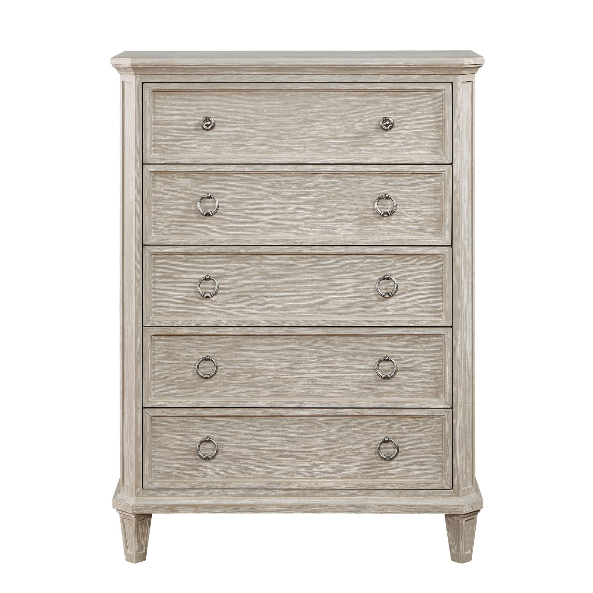 In a modern look on traditional design, the Leander Collection combines refined lines with classic accenting to create an elegant statement for your bedroom. Clipped corners define the profile of the chest while picture frame molding lends detail to the fronts of each drawer, and pilasters. Weathered nickel ring pull hardware centers the drawers with the chest also featuring knob hardware on the top drawer. The oak veneer of the collection is finished in light brown.