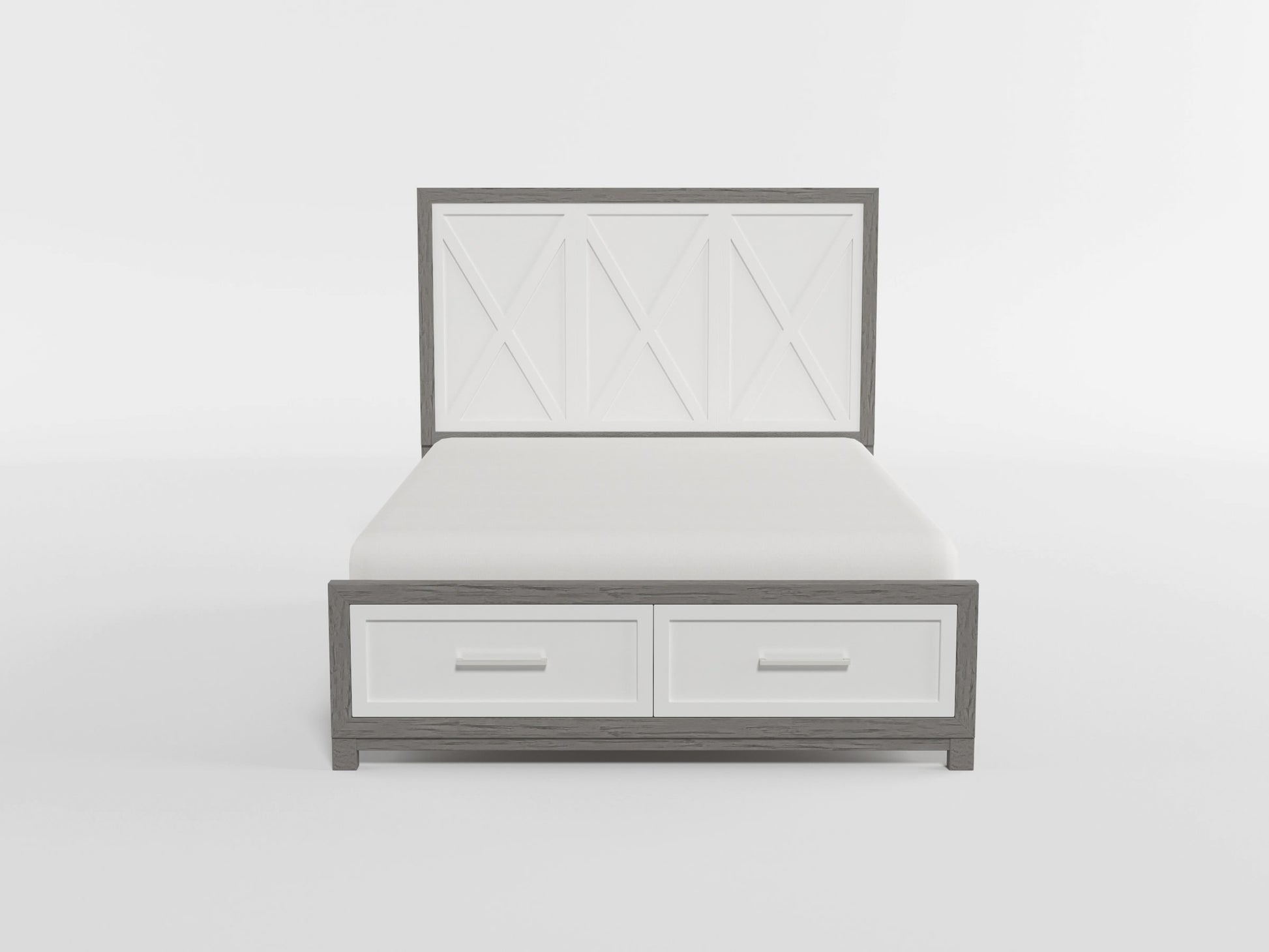 Maximize both style and storage in your bedroom with this Queen Size, two-tone platform bed, featuring a unique ivory and gray finish crafted from okume veneer, wood, and engineered wood. The footboard boasts two dovetail drawers with smooth ball-bearing glides, providing ample space for clothing and linens. Polished nickel-tone bar pulls add a touch of modern sophistication, while the complete set, including the headboard, footboard, slats, and rails, ensures a supportive and stylish sleep experience. Designed to eliminate the need for a foundation or box spring, this platform bed offers a sleek, low-profile look that complements various décor styles. Assembly is required.