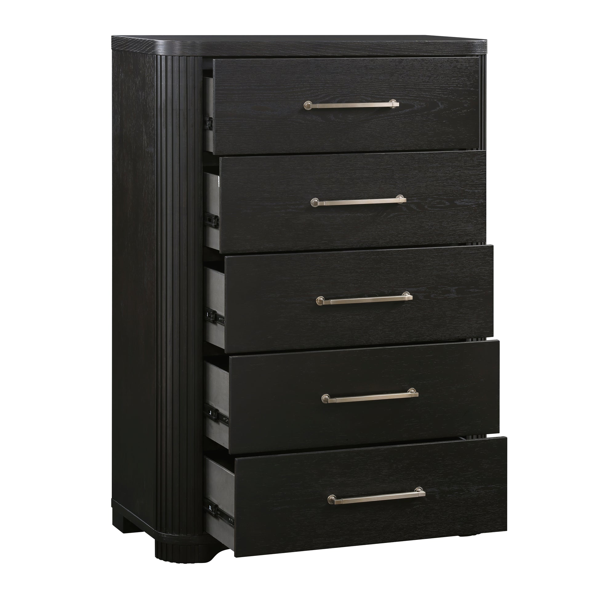 Elegant modern styling comprises the design of the Gilbert Collection while drawing subtle inspiration from the Art Deco movement. The oak veneer of the collection features a charcoal finish providing a rich hue to the distinct wood grain. Polished brass-tone bar pulls center each drawer of the chest for complementing contrast.