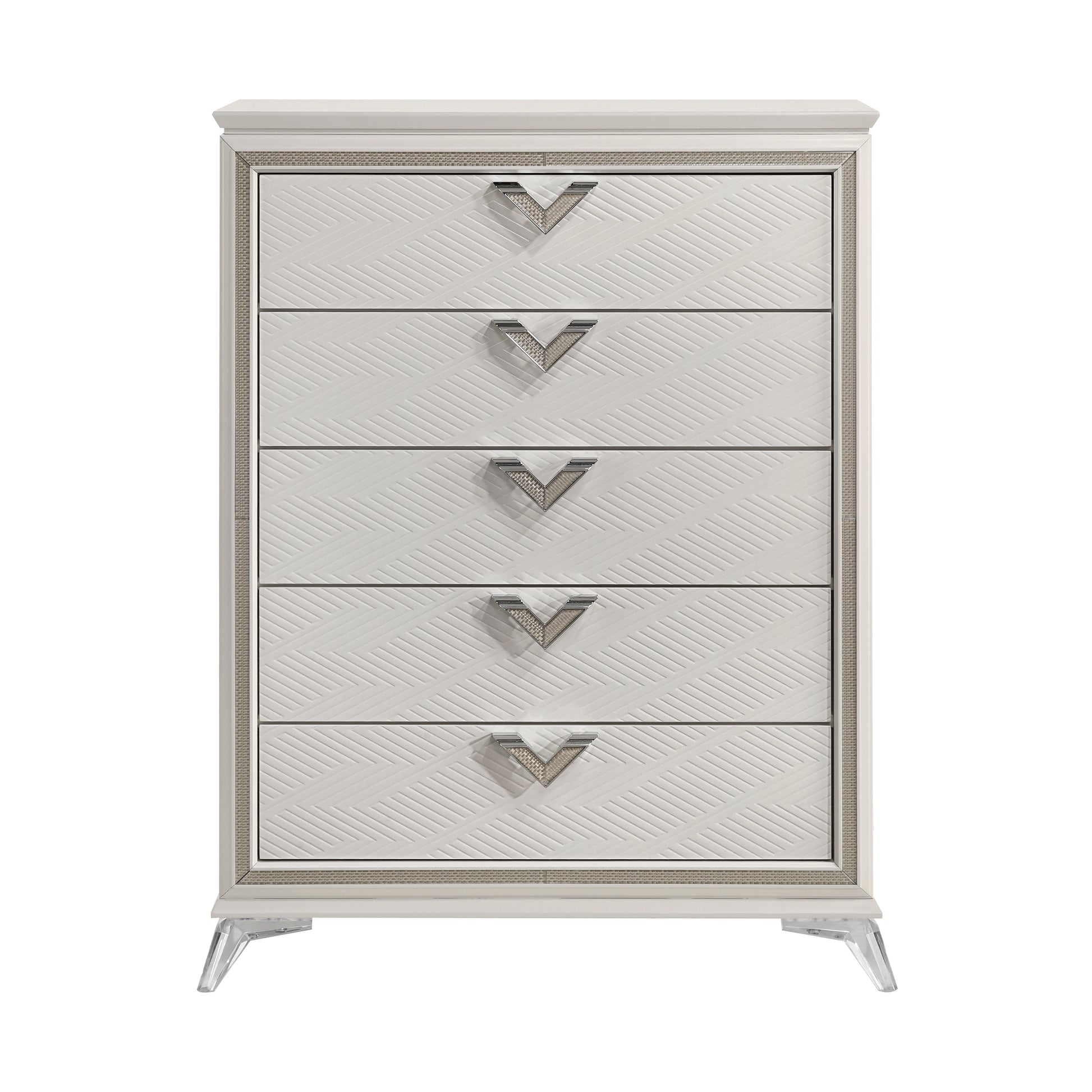 Maximize your storage with the sophisticated and stylish white and gold 5-drawer chest. Crafted with a durable engineered wood frame, complemented by unique acrylic front legs and sturdy metal rear legs, this chest offers a perfect blend of stability and contemporary glamour. The five smooth-gliding dovetail drawers, equipped with ball bearing glides, provide ample storage for your clothing and accessories. The diagonal grain embossed drawer fronts add a sophisticated texture, while the polished chrome tone triangle pull handles enhance the modern aesthetic. This chest seamlessly blends functionality with high-end design, making it a perfect addition to any contemporary bedroom. Assembly is required, allowing you to easily incorporate this stylish piece into your space.