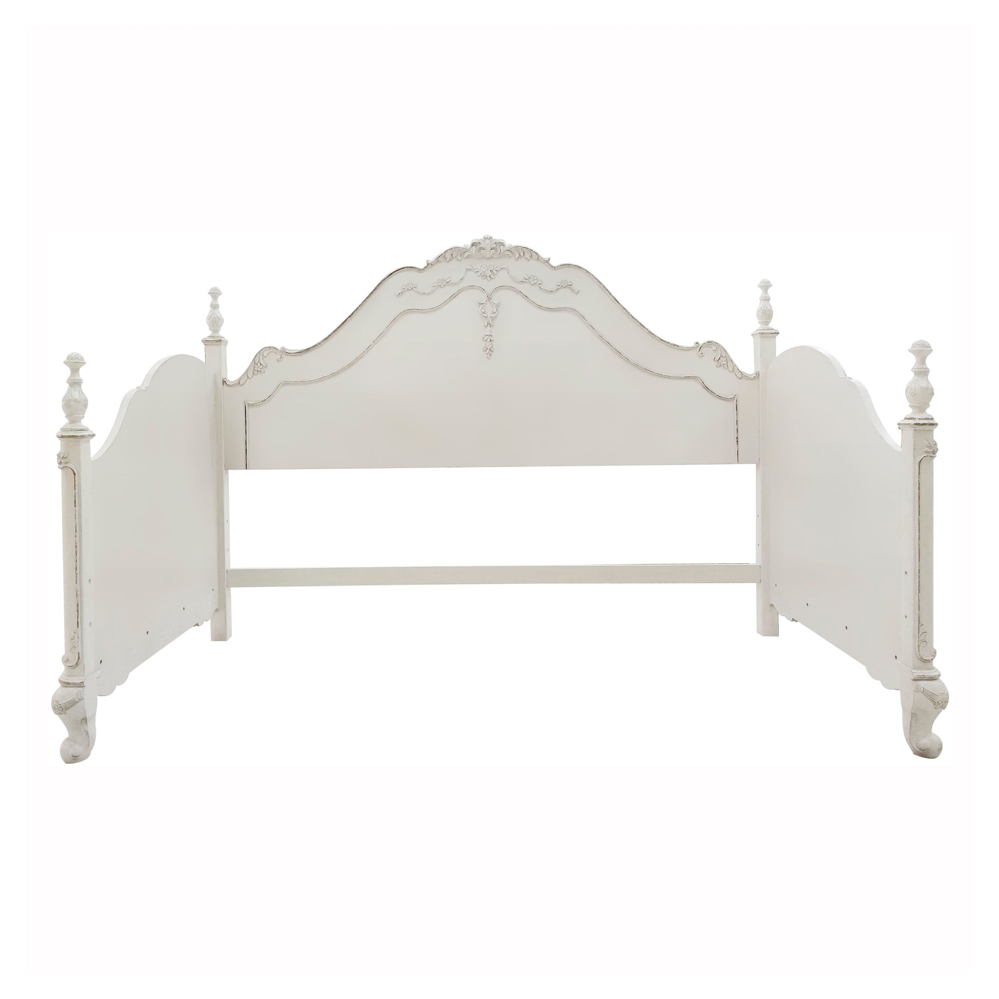 The Cinderella Collection is your little child’s dream come true. The Victorian styling incorporates traditional floral motif carving details on the white with gray rub-through finished twin daybed that will create the feeling of stepping into a fairy tale. Carved finials top the corner posts of each post further lending to the classic look. Chest, dresser, mirror, nightstand, TV armoire, lingerie chest, desk, hutch, desk chair, twin canopy poster bed, twin trundle, full canopy poster bed, twin bed, full bed and queen bed are also available. Link spring is not included.
