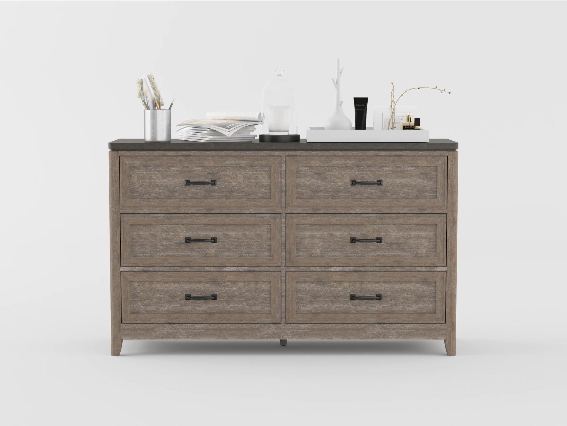 The Newell Collection’s subtle rustic aesthetic and transitional style pairs effortlessly with your desire to refresh your bedroom’s current look. The design of the dresser’s drawer fronts features recessed picture frame molding while dark-finished metal bar hardware accents each drawer front, creating perfect contrasting complement to the two-tone gray and oak finish of the piece’s oak veneer.