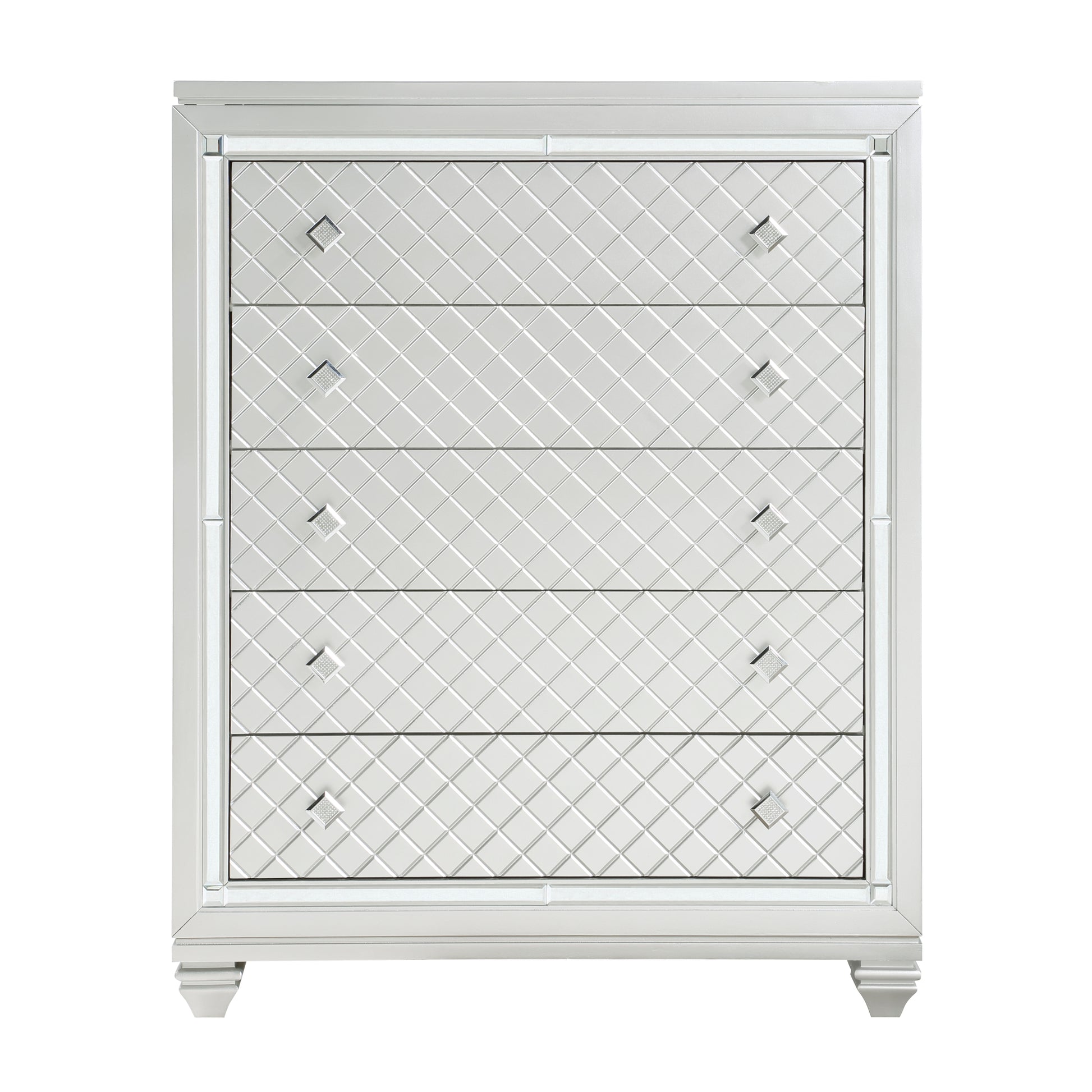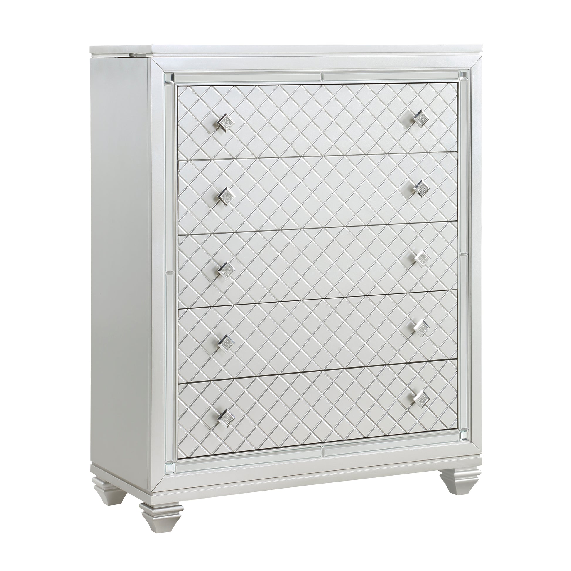 The bold visual presentation of the Leesa Collection complements your glamorous design aspirations. Diamond pattern drawer fronts and hardware, and mirrored framing are featured on the silver-finished chest. The top of the chest opens to reveal a hidden jewelry compartment, its ease of use enhanced with a mirror mounted on the underside of the chest’s top.