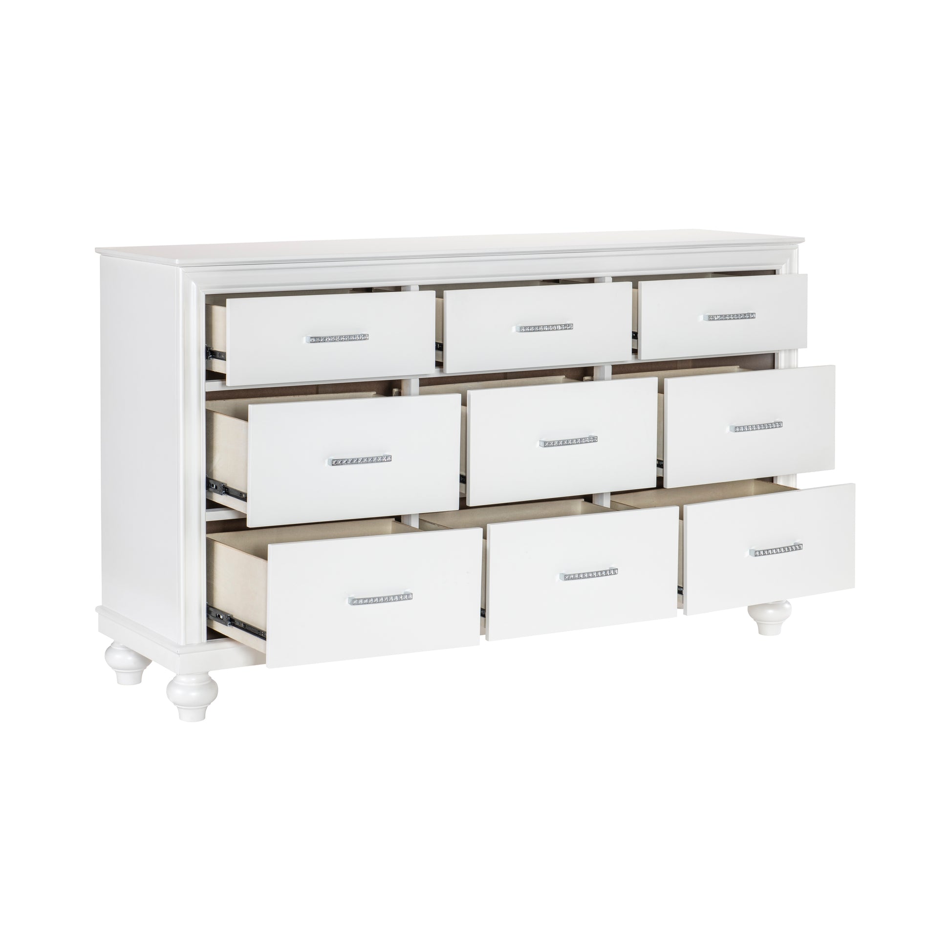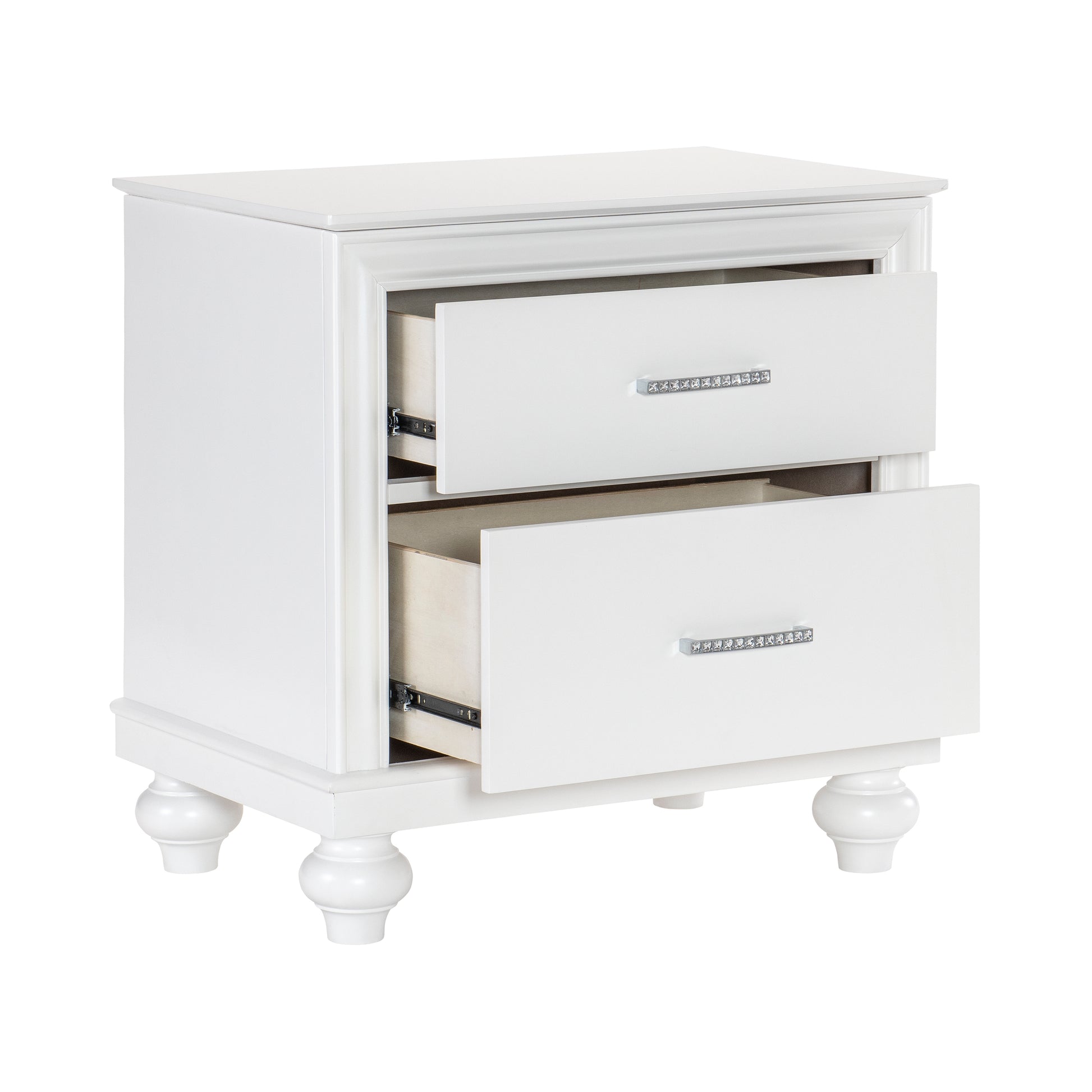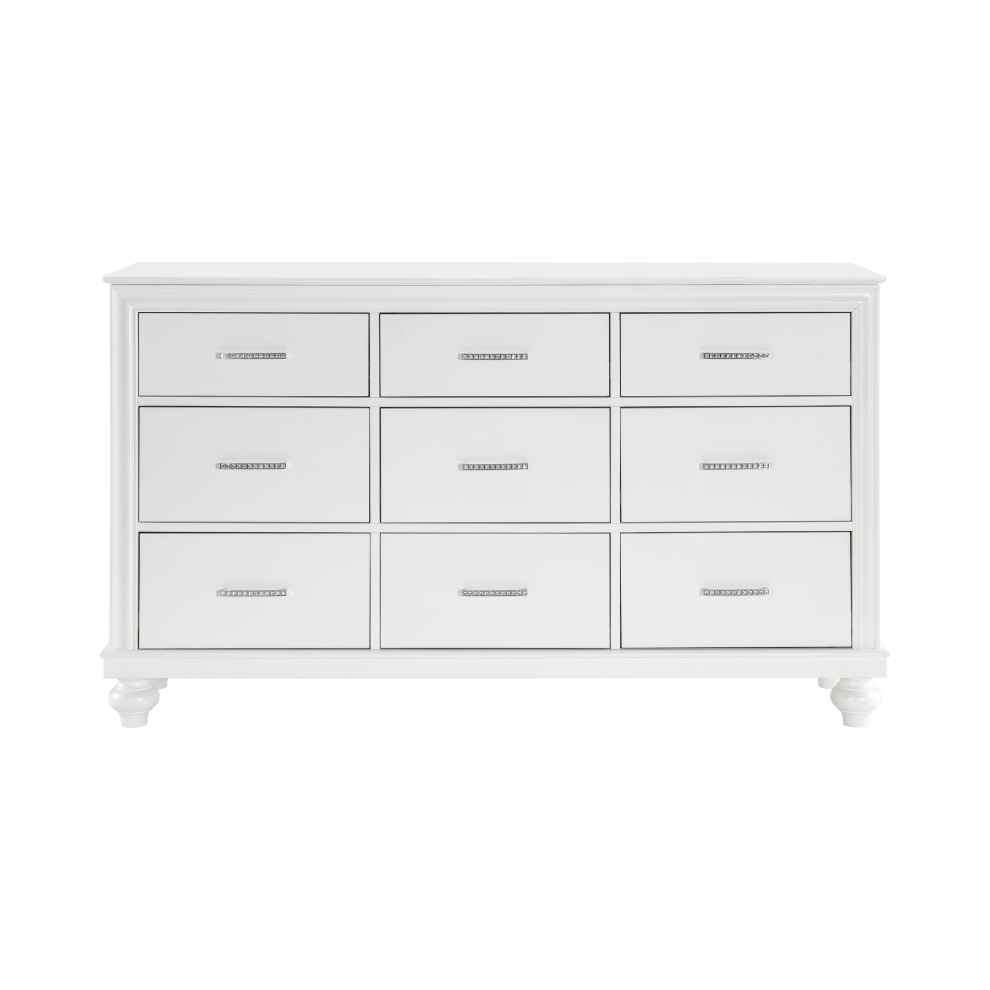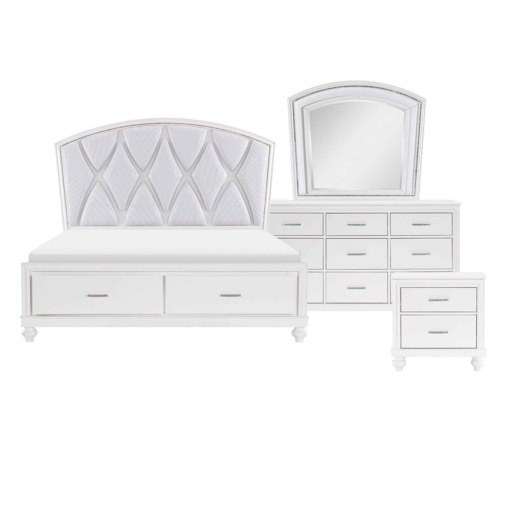 Visually mesmerizing, light dances off the accentuating details of the elegant Aria Collection. The eye-catching iridescence of the headboard’s upholstered fabric panels is illuminated with back-lit LED while the embedded acrylic crystal hardware that fronts each drawer sparkles against the bright white finish of the collection. Additional storage within your bedroom comes in the form of the footboard’s drawers, their placement a convenient location for clothing or linens.