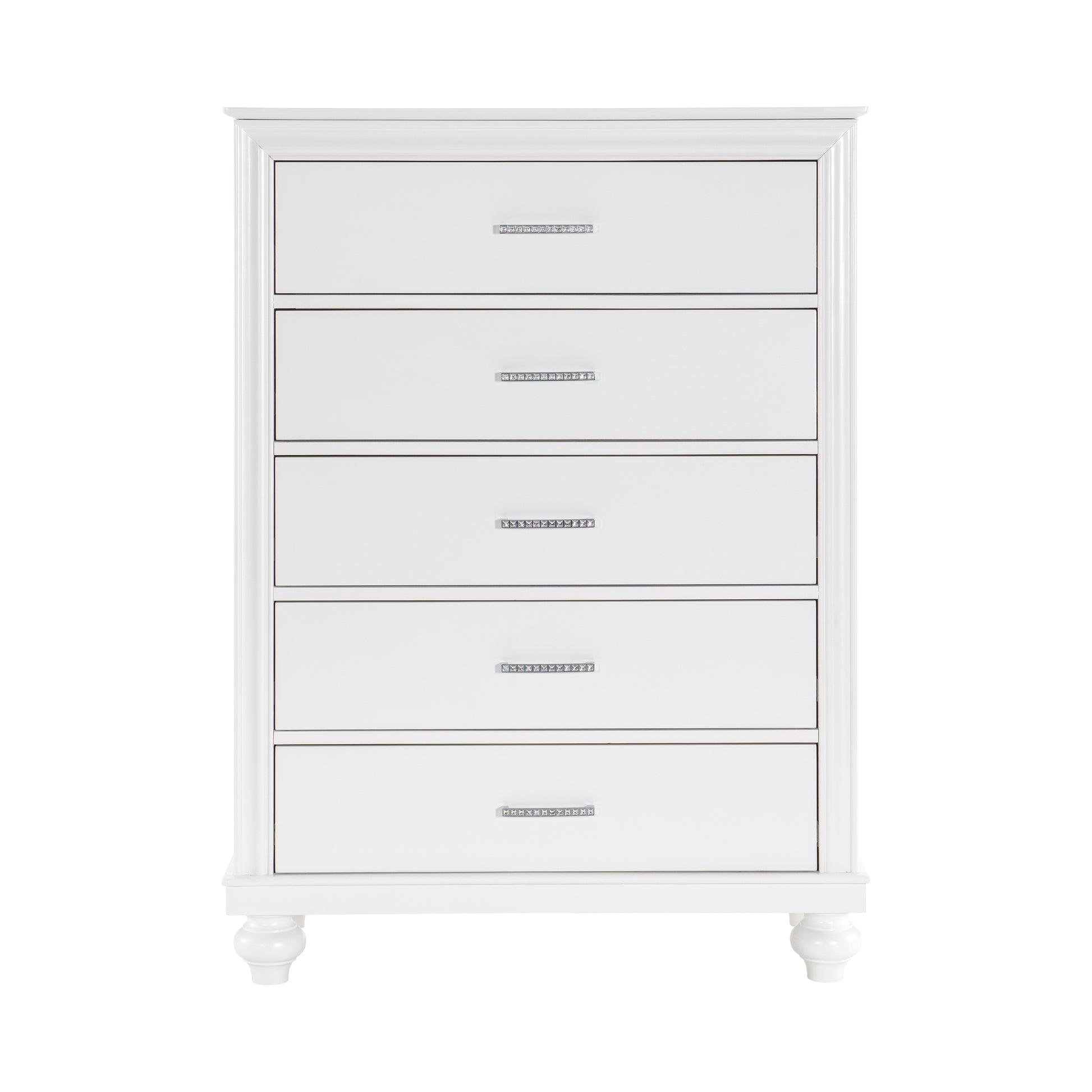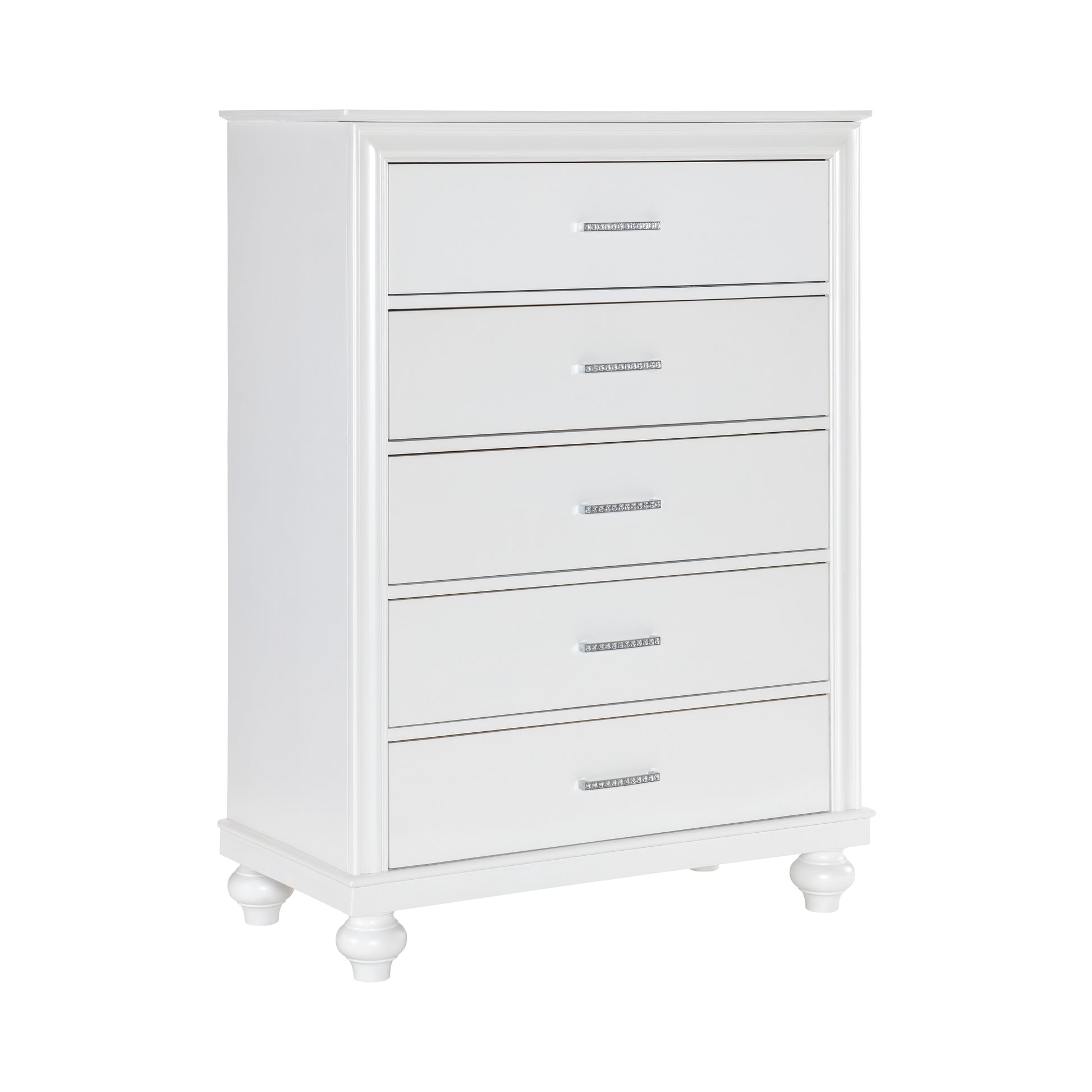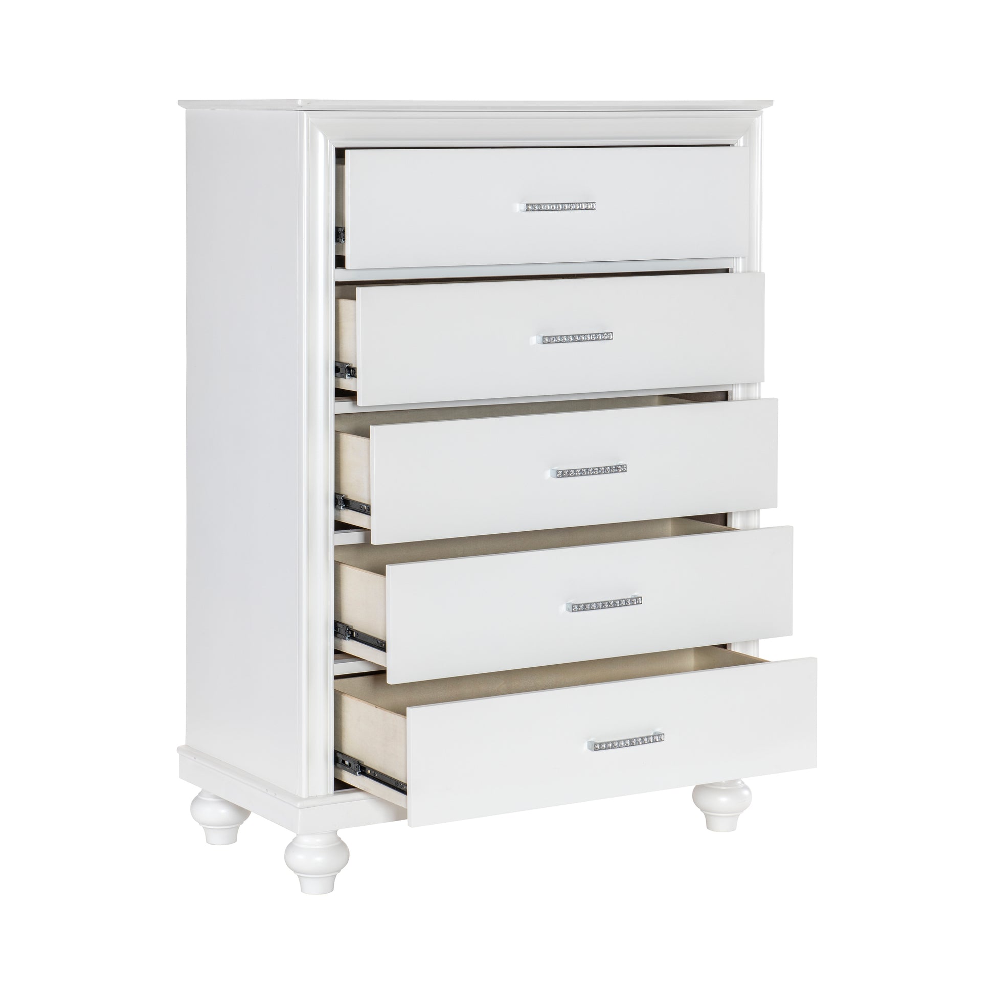 Visually mesmerizing, light dances off the accentuating details of the elegant Aria Collection. The eye-catching iridescence of the embedded acrylic crystal hardware that fronts each drawer sparkles against the bright white finish of the collection.