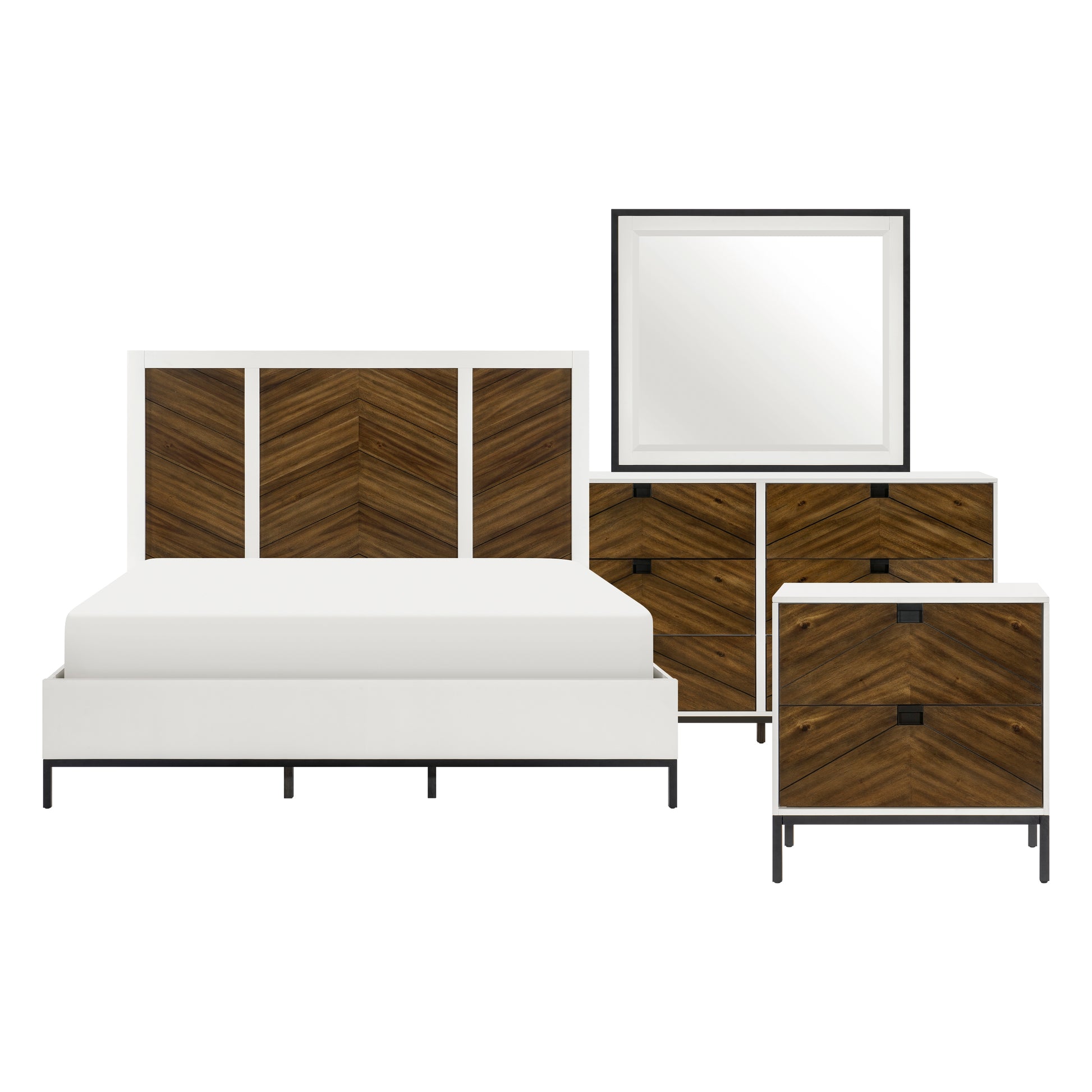 Thoroughly modern with a nod to Mid-Century design, from its clean lines to bold accents, the Oslo Collection perfectly defines your preference for inspired design. V-match pattern acacia veneer fronts the drawers and headboard, with the walnut finish that highlights their grain providing distinct contrast to the bright white finish of the collection. The intersection of the drawer front’s routed detail is centered by square black inset hardware, the combination a stunning detail. Black-finished metal legs provide support to each piece of the collection.