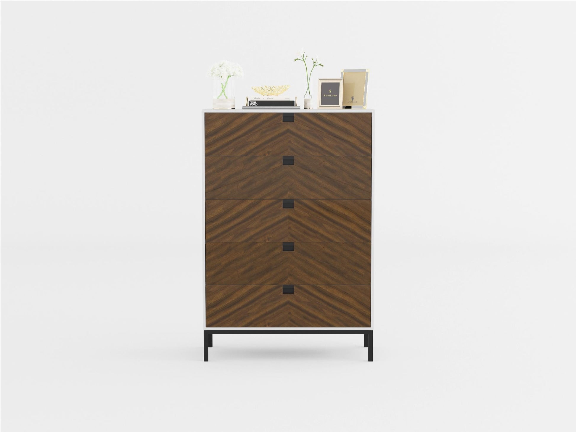 Thoroughly modern with a nod to Mid-Century design, from its clean lines to bold accents, the Oslo Collection perfectly defines your preference for inspired design. V-match pattern acacia veneer fronts the drawers of the chest, with a walnut finish that highlights the grain, providing distinct contrast to the bright white finish of the piece. The intersection of the drawer front’s routed detail is centered by square black inset hardware, the combination a stunning detail. Black-finished metal legs provide support to the chest.