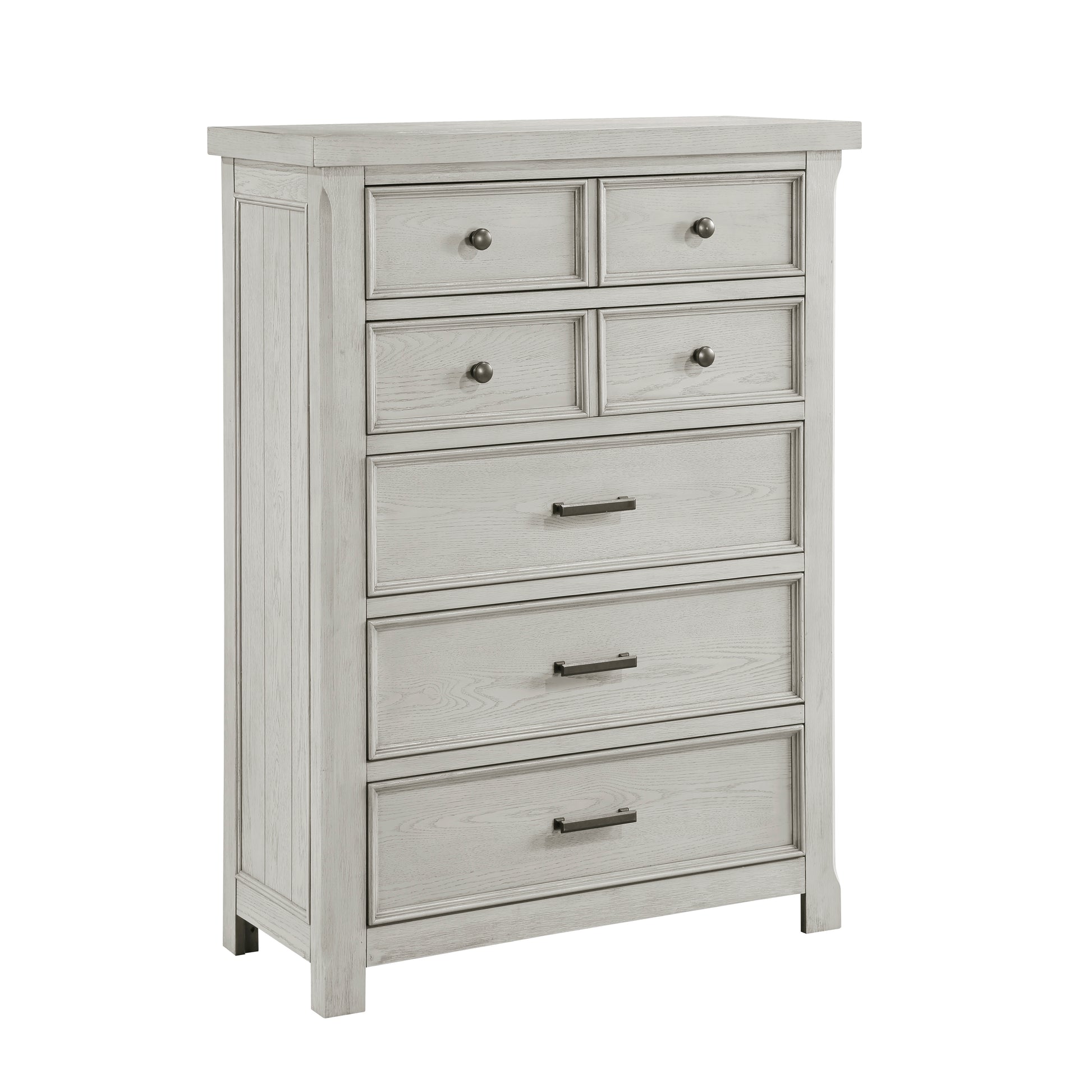 The Providence Collection’s lines and versatile finish create a classic addition for your bedroom. Oak veneer is finished in light gray, serving as a neutral canvas for your personal decorative preferences. The antique black tone metal knob and bar hardware provide complementing contrast to the light finish of the chest.