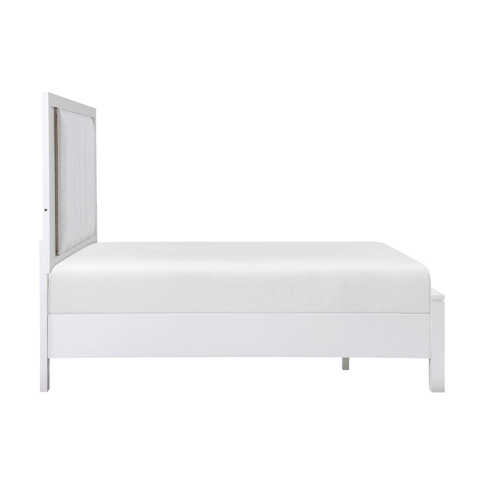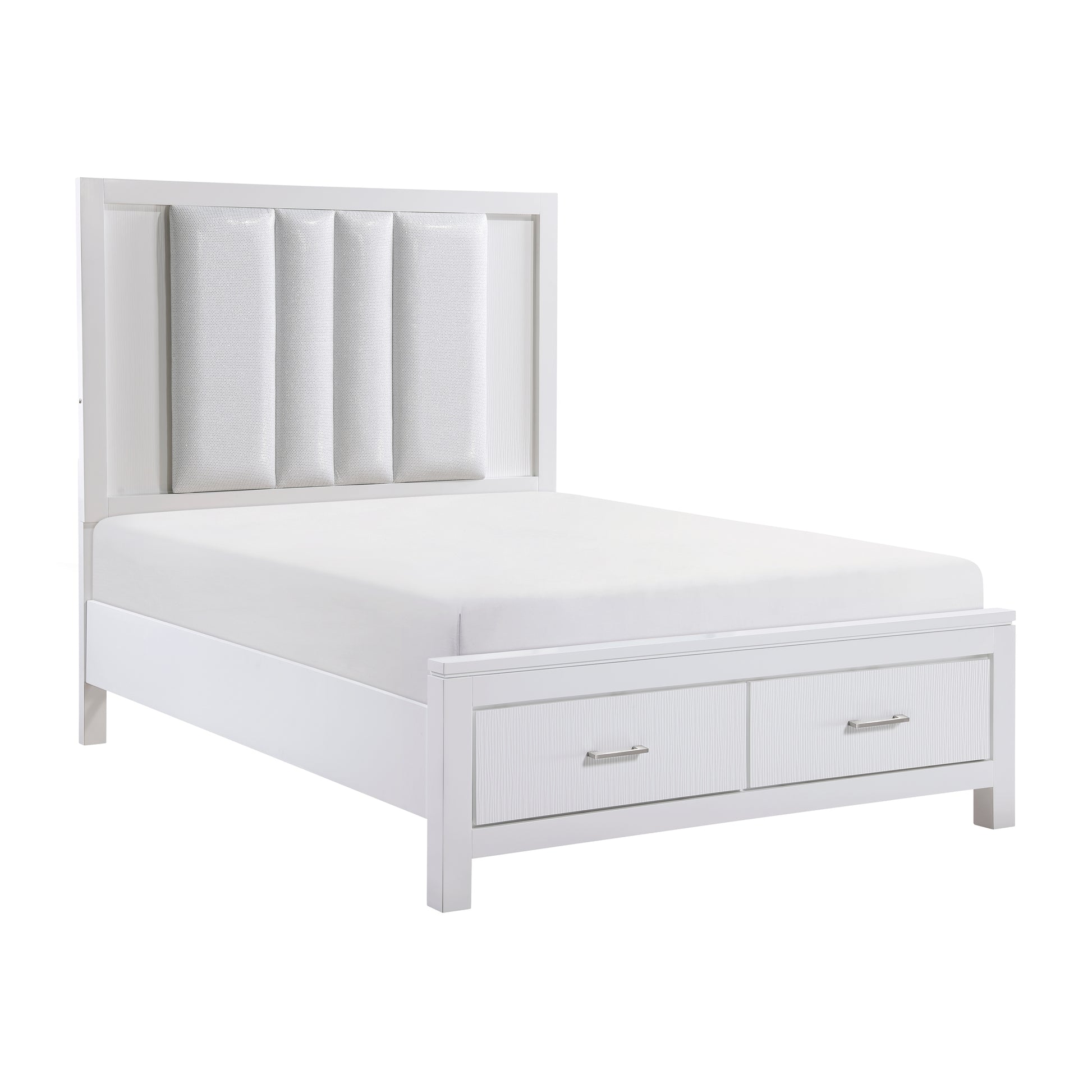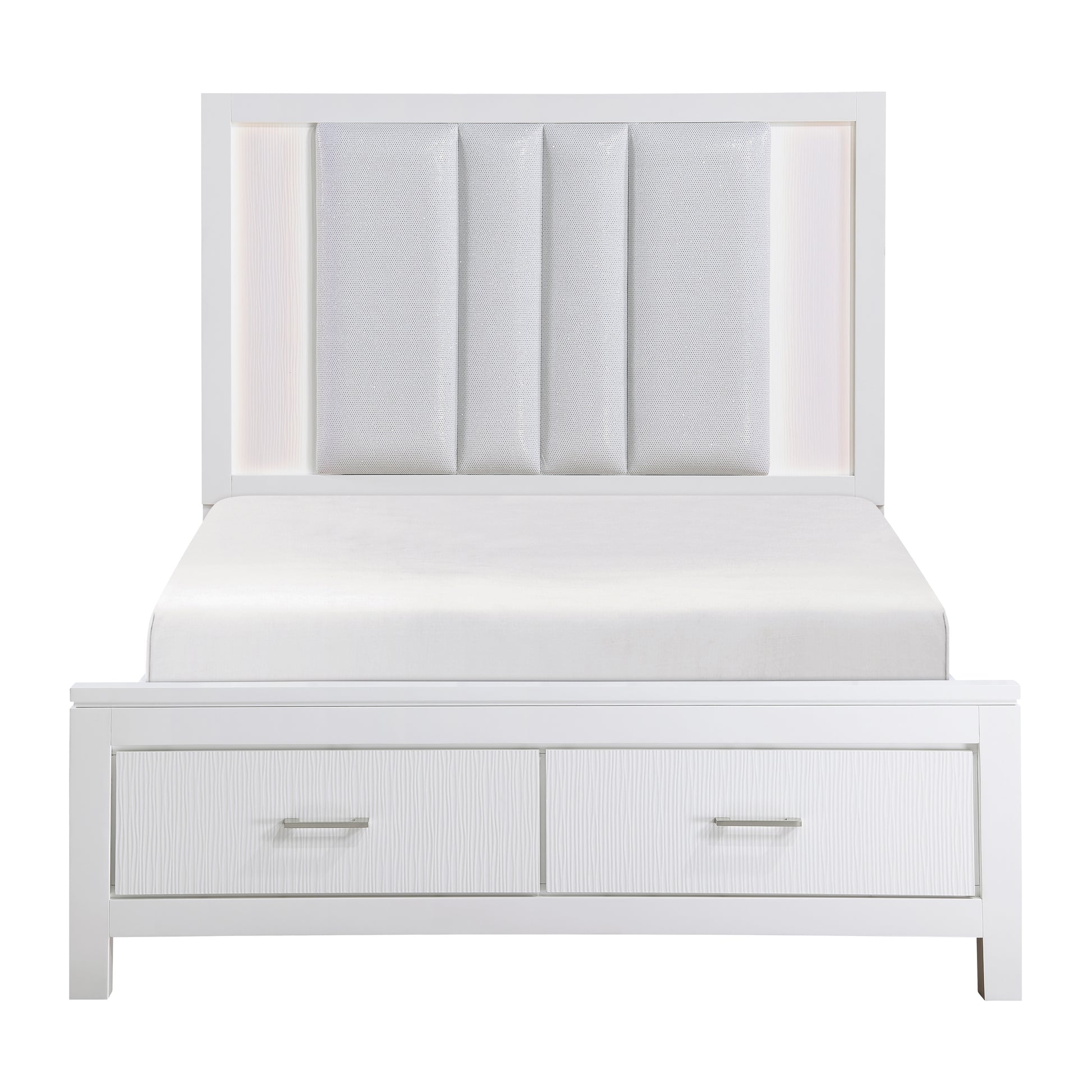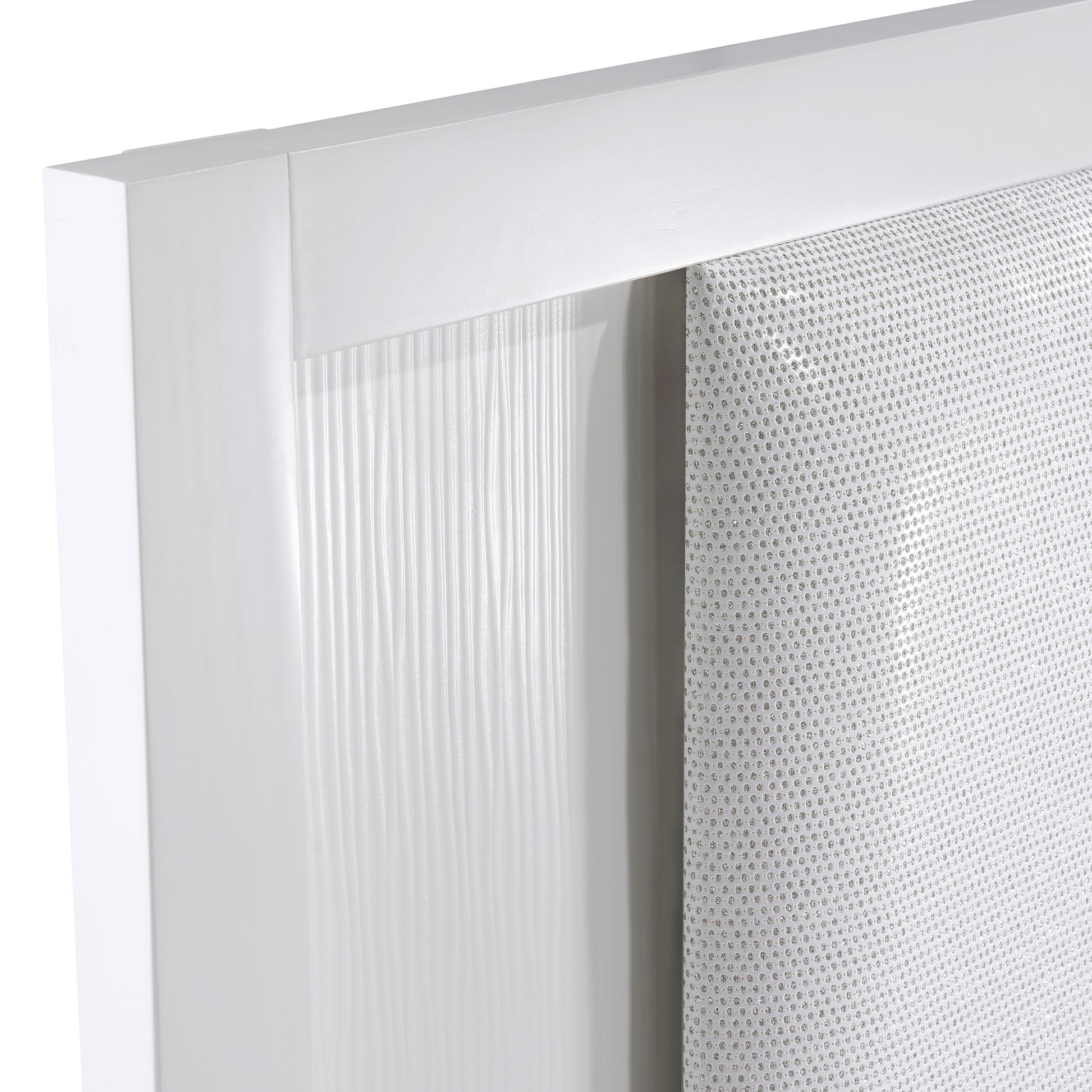 Illuminating your room with an iridescent glow, the Prism Collection creates an atmosphere of modern glamour for your boudoir. The white finish of the collection serves to create a neutral slate for your decorative whims, letting the colors you choose reflect your shining personality. The embossed headboard backing provides texture to the Eastern King bed while the iridescent fabric upholstery of the headboard's back panel sparkles when illuminated by LED backlighting. The panel bed also features footboard drawers, creating the coveted additional storage space every bedroom needs.