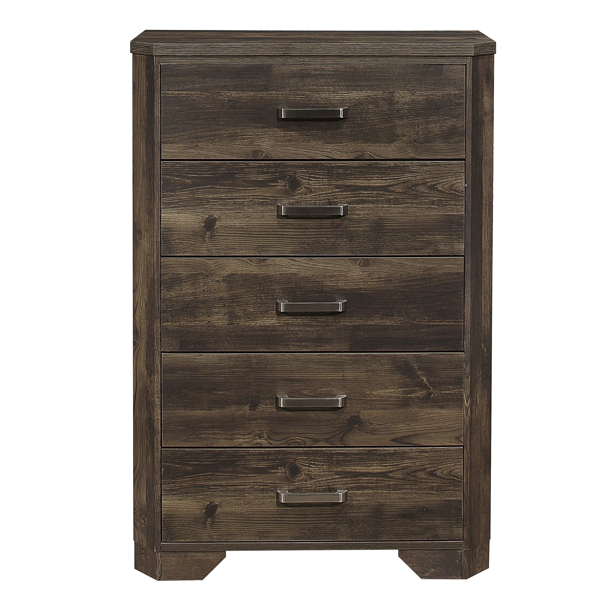 The transitional styling of the Jocelyn Collection is achieved by blending the natural rustic look of wood grain and clean lines to create a chest that will fit right in with your home’s aesthetic. The brown hue of the printed faux-wood grain is perfectly complemented by the subtle contrast of the nickel-finished metal fixed drawer pulls. Clipped corners define the profile of the chest’s frame.