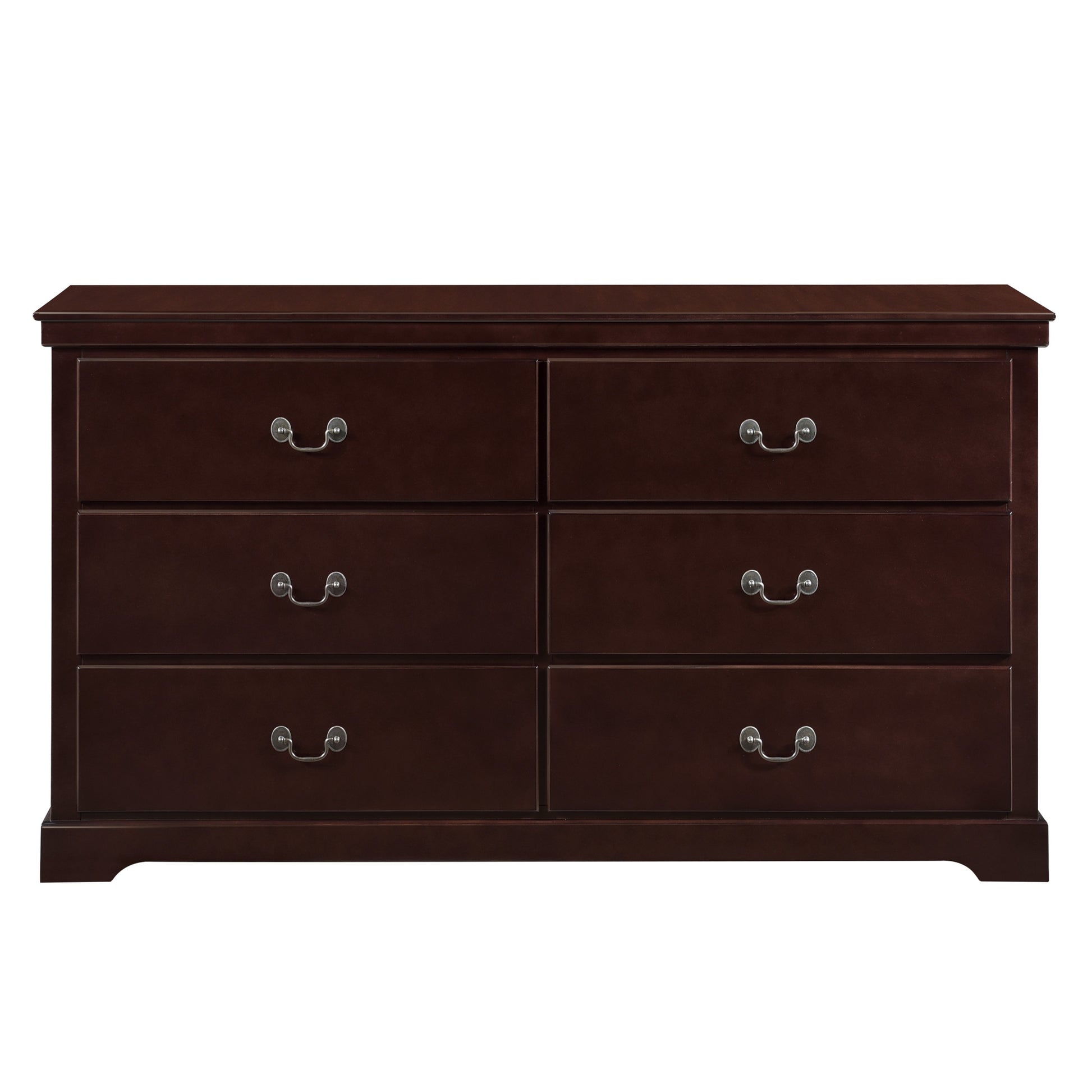 Merging traditional and transitional design creates the look of the Seabright Collection, providing a unique platform from which to style your bedroom. The cherry finish allows for exceptional versatility of placement and decorative inspiration. The bed features framed, color-coordinated, faux leather padded headboard insert and an ultra-low-profile footboard. The traditional styling of the satin nickel finished bale and pull hardware lends to the classic profile.