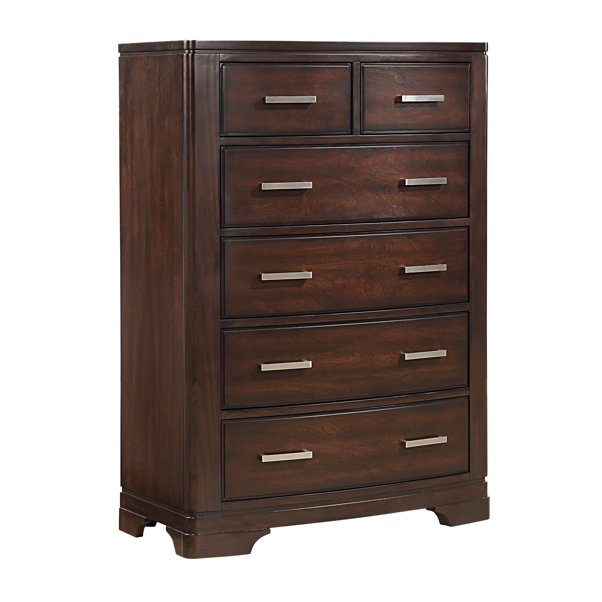 The intersection of modern lines and understated transitional style blend to create the Hudson Collection. The cherry finish over birch veneer, of the chest presents a decoratively versatile addition to your bedroom. Polished chrome bar hardware fronts the drawers of the chest.