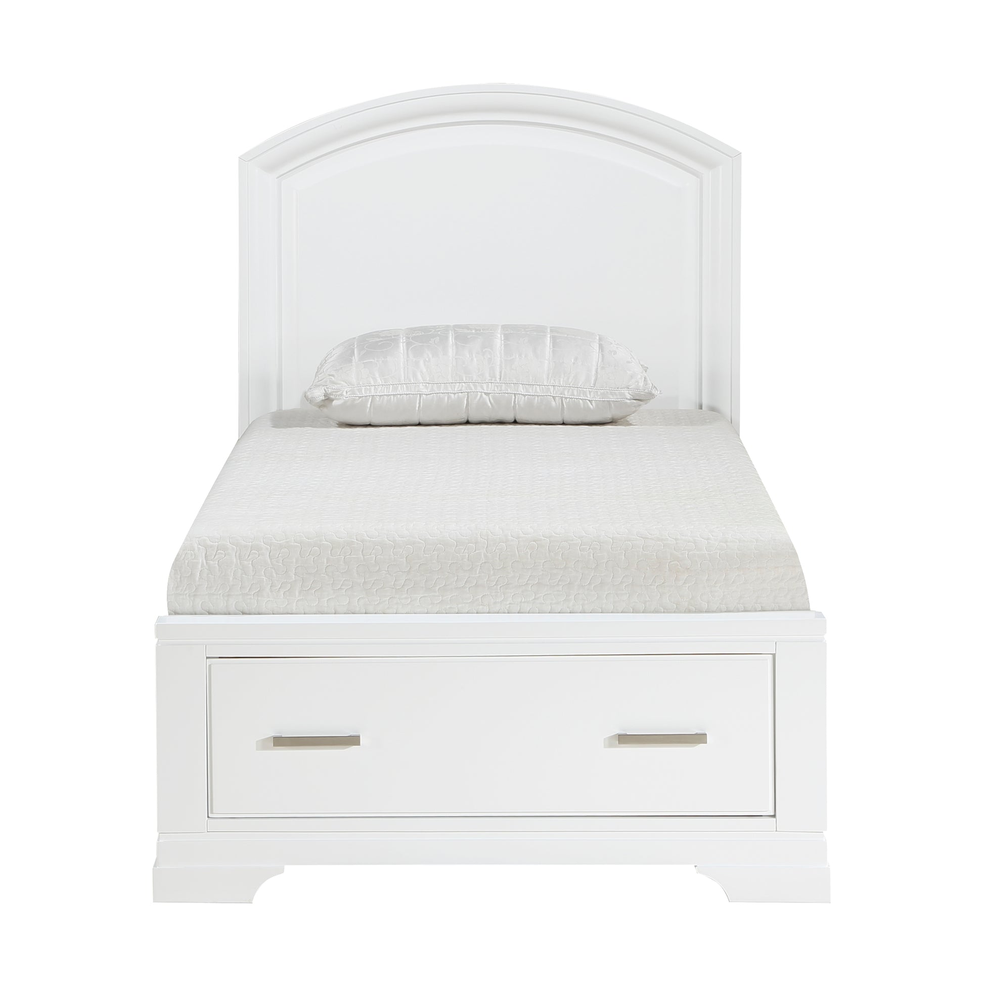 The intersection of modern lines and understated transitional style blend to create the Hudson Collection.The white finish over of the twin bed presents a decoratively versatile addition to your bedroom. Polished chrome bar hardware fronts the storage drawer of the bed’s footboard. The curved design of the bed’s headboard lends subtle decorative shape to the collection.
