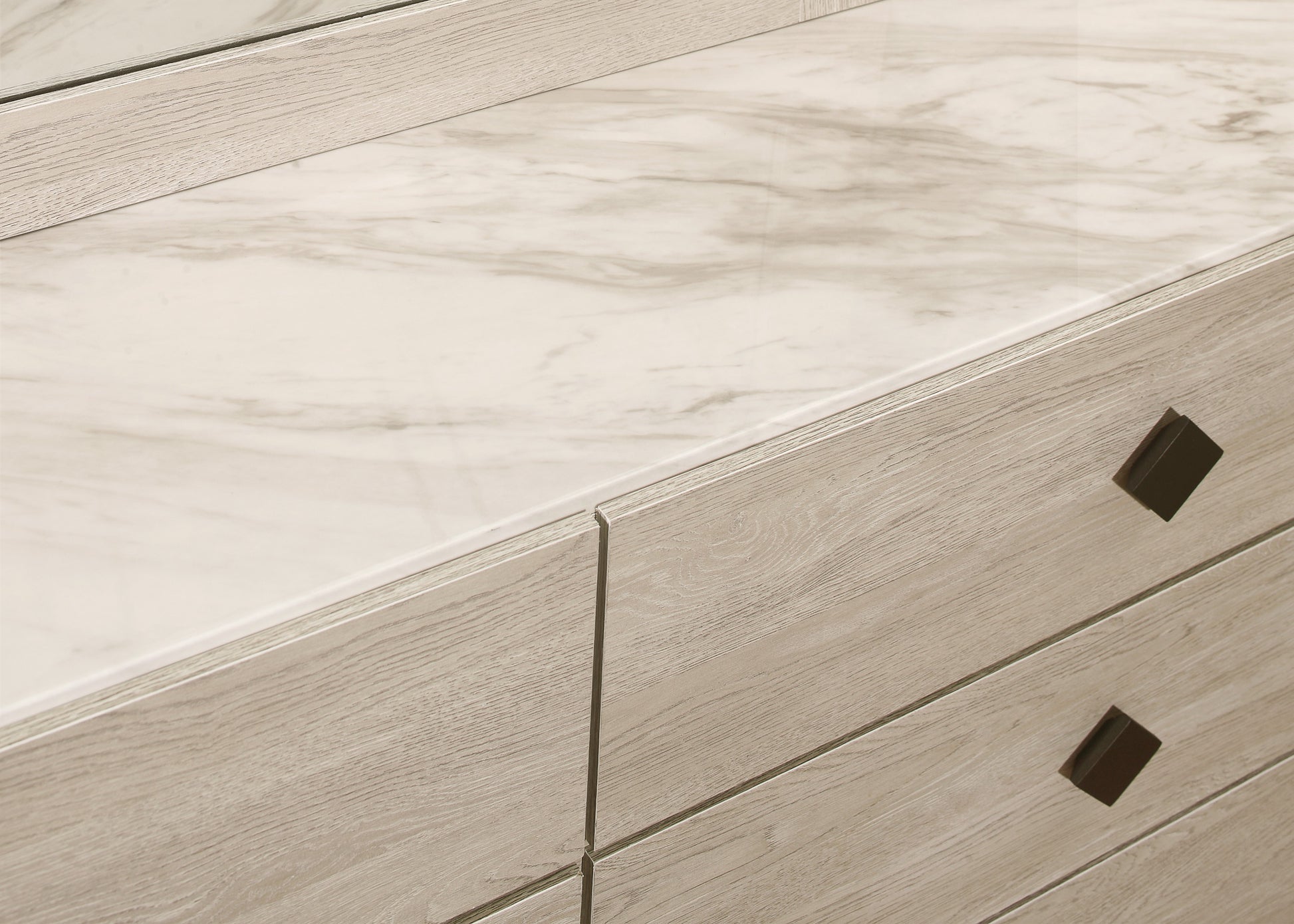 Modern design is given subtle glamorous accent in the design of the Whiting Collection. Black square hardware boldly fronts each drawer of the dresser with black base framing lending additional accent to the cream marble-look of the collection.