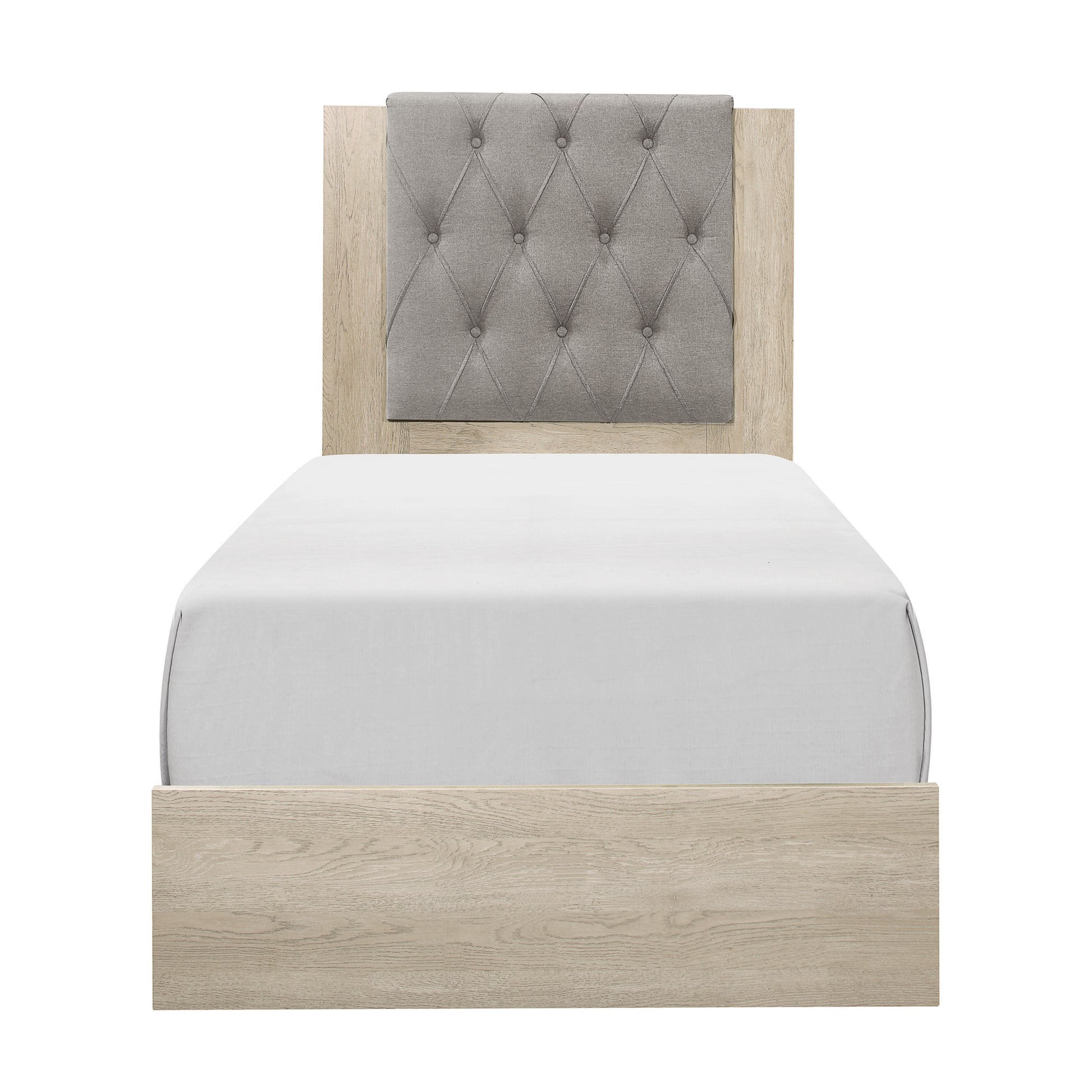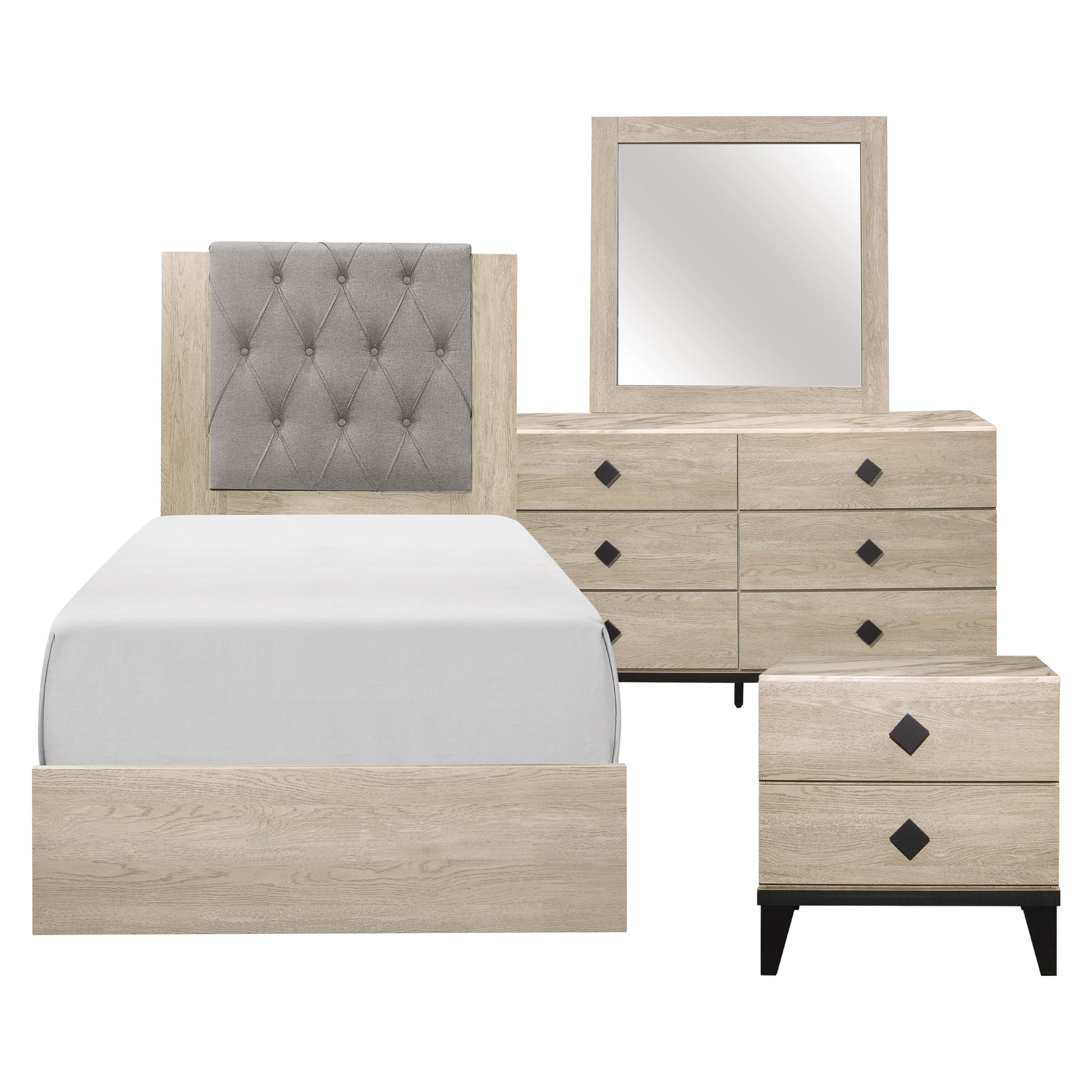 Modern design is given subtle glamorous accent in the design of the Whiting Collection. The bed’s construction allows for convenient packaging, lending to the overall design of the profile. The ultra-low, streamlined profile of the rails and footboard carries over into the design of the accompanying case pieces. Gray tufted linen graces the front of the headboard lending to the dramatic look. Black square hardware boldly fronts each drawer with black base framing lending additional accent to the printed marble-look of the collection.