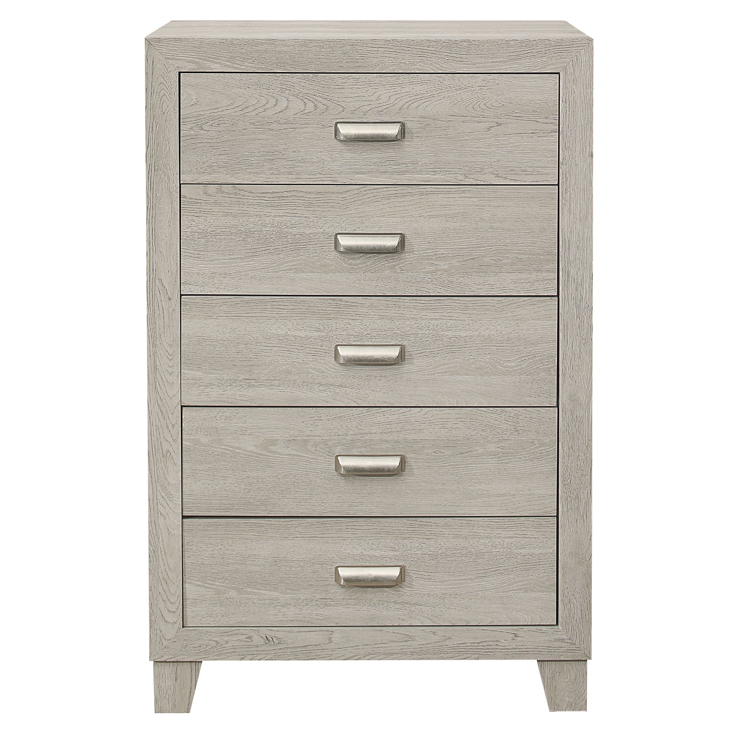 The modern styling of the Quinby Collection is achieved by blending the natural look of wood grain and the clean lines of contemporary design to create a unique bedroom group that will fit right in with your home’s aesthetic. The embossed faux-wood grain of the chest is perfectly complemented by the subtle contrast of the nickel-finished metal fixed drawer pulls and the clean, defining lines of the framing.