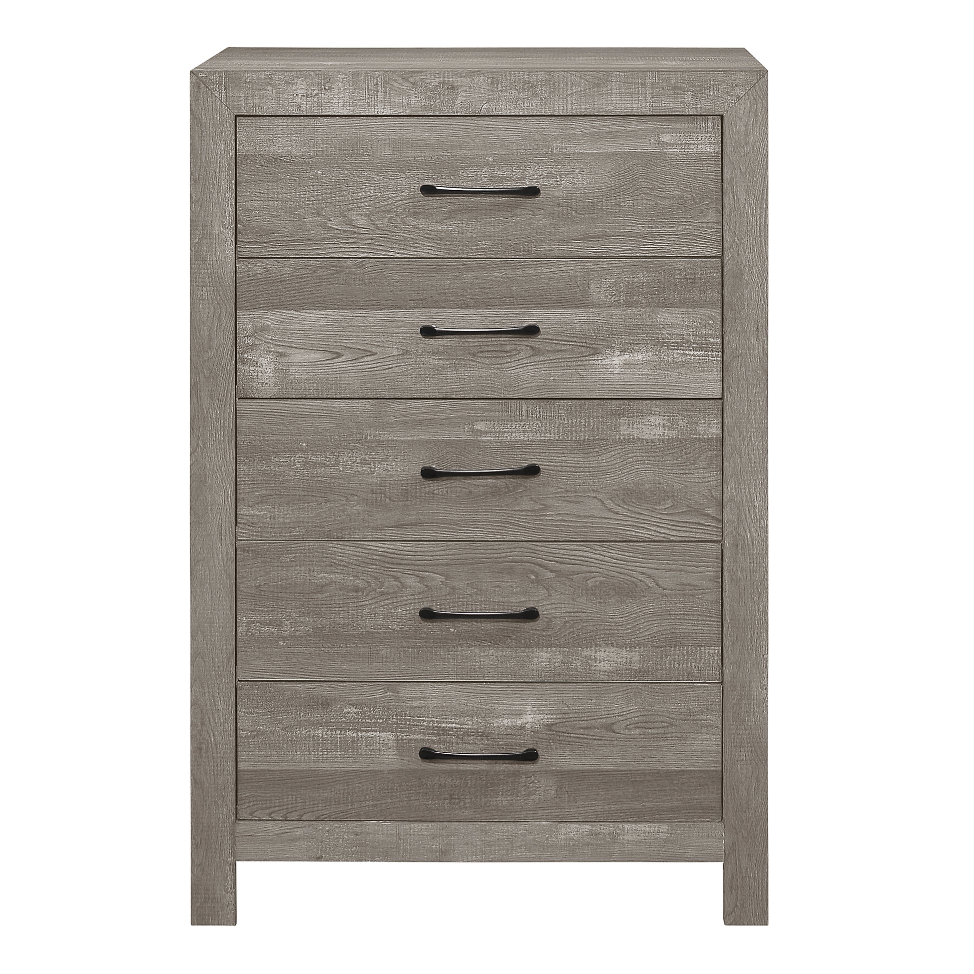 Modern lines and rustic styling are paired to create the look of the Corbin Collection. The 3D printed paper veneer’s texture is highlighted by a gray finish for a realistic wood look. Providing complementing contrast, the drawer fronts of the chest feature black metal hardware. Subtle framing defines the profile of the chest, further lending to the unfettered design of the collection.