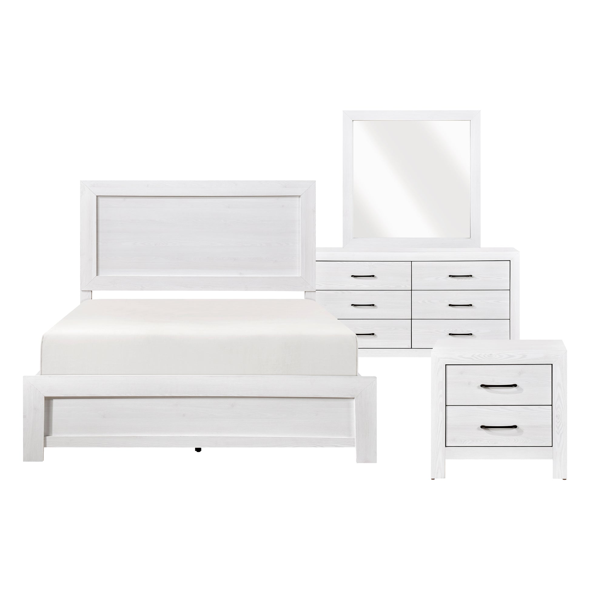 Modern lines and rustic styling are paired to create the look of the Corbin Collection. The 3D printed paper veneer’s texture is highlighted by a white finish for a realistic wood look. Providing complementing contrast, the drawer fronts of the dresser, chest and nightstand feature black metal hardware. Subtle framing defines the profile of the headboard and footboard, further lending to the unfettered design of the collection.