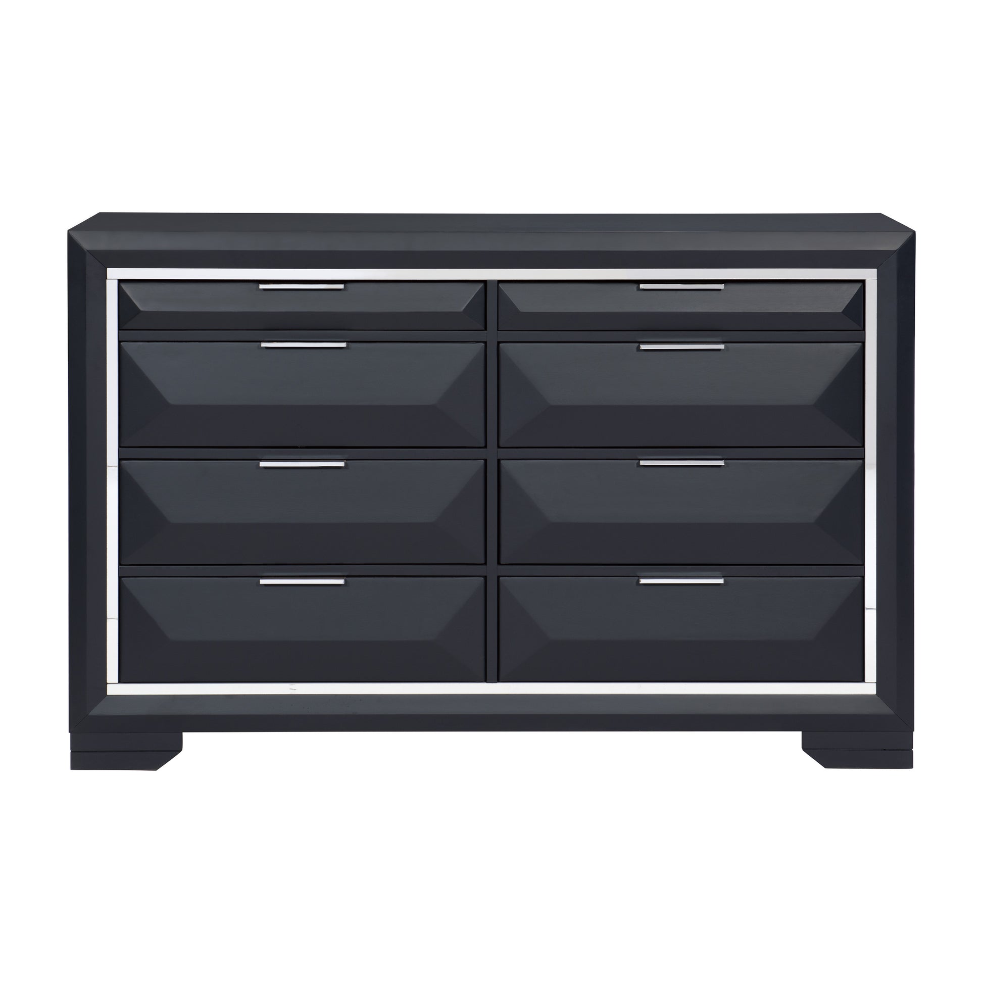 The modern design of the Rosemont Collection creates a striking profile for your bedroom. The midnight blue finish is reflected by the chrome banding that defines the front of each piece in the collection. The bookcase headboard and storage footboard proved additional functional storage space beyond the available dresser, chest and night stand. Chrome pull hardware fronts each of the raised drawer fronts.