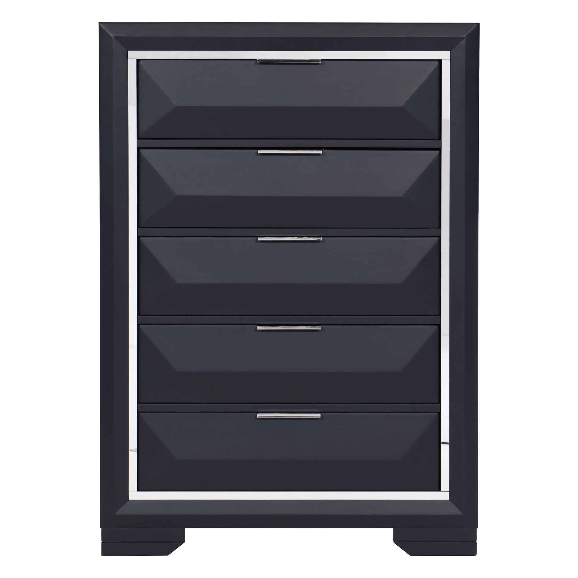 The modern design of the Rosemont Collection creates a striking profile for your bedroom. The midnight blue finish is reflected by the chrome banding that defines the front of the chest. Chrome pull hardware accents each of the raised drawer fronts.