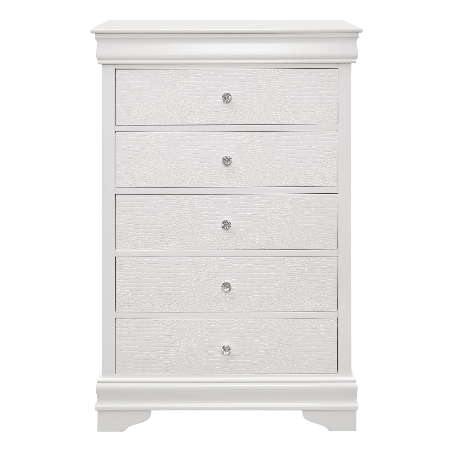 The unexpected intersection of traditional design and glamorous styling creates the dynamic look of the Lana Collection. A white finish is utilized to enhance the faux alligator embossed drawer fronts of the chest with crystal faceted knob hardware lending an additional fabulous touch. The chest features hidden storage allowing for the discrete placement of your personal affects.