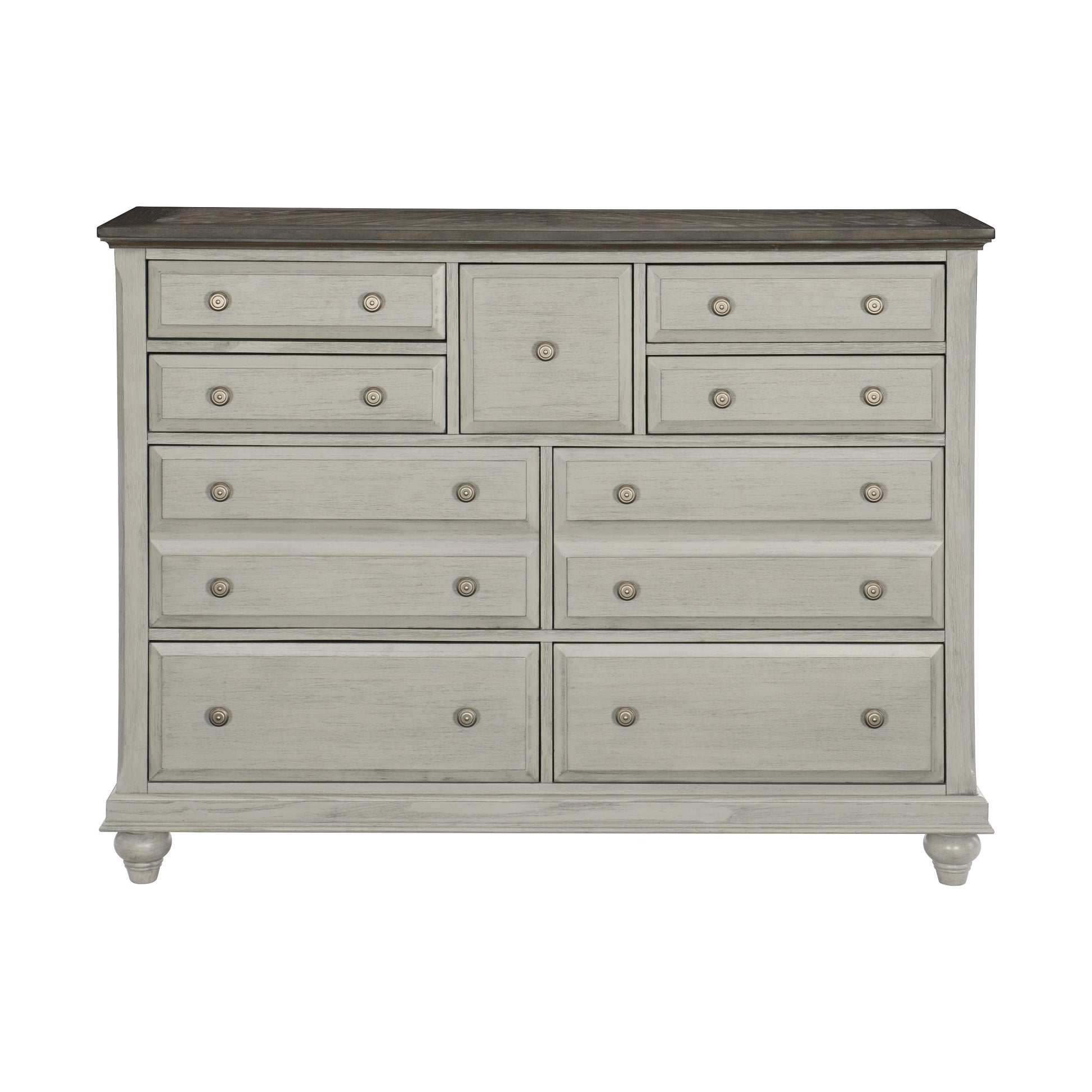 In nod to modern farmhouse design, the Mossbrook Collection features a classic profile that will be a perfect addition to your home’s décor. The pine solids and oak veneer of the collection feature a light gray finish, subtly highlighting the wood’s grain. The dark brown top of the dresser provides contrast, as do the antique pewter tone knobs that front the drawers.