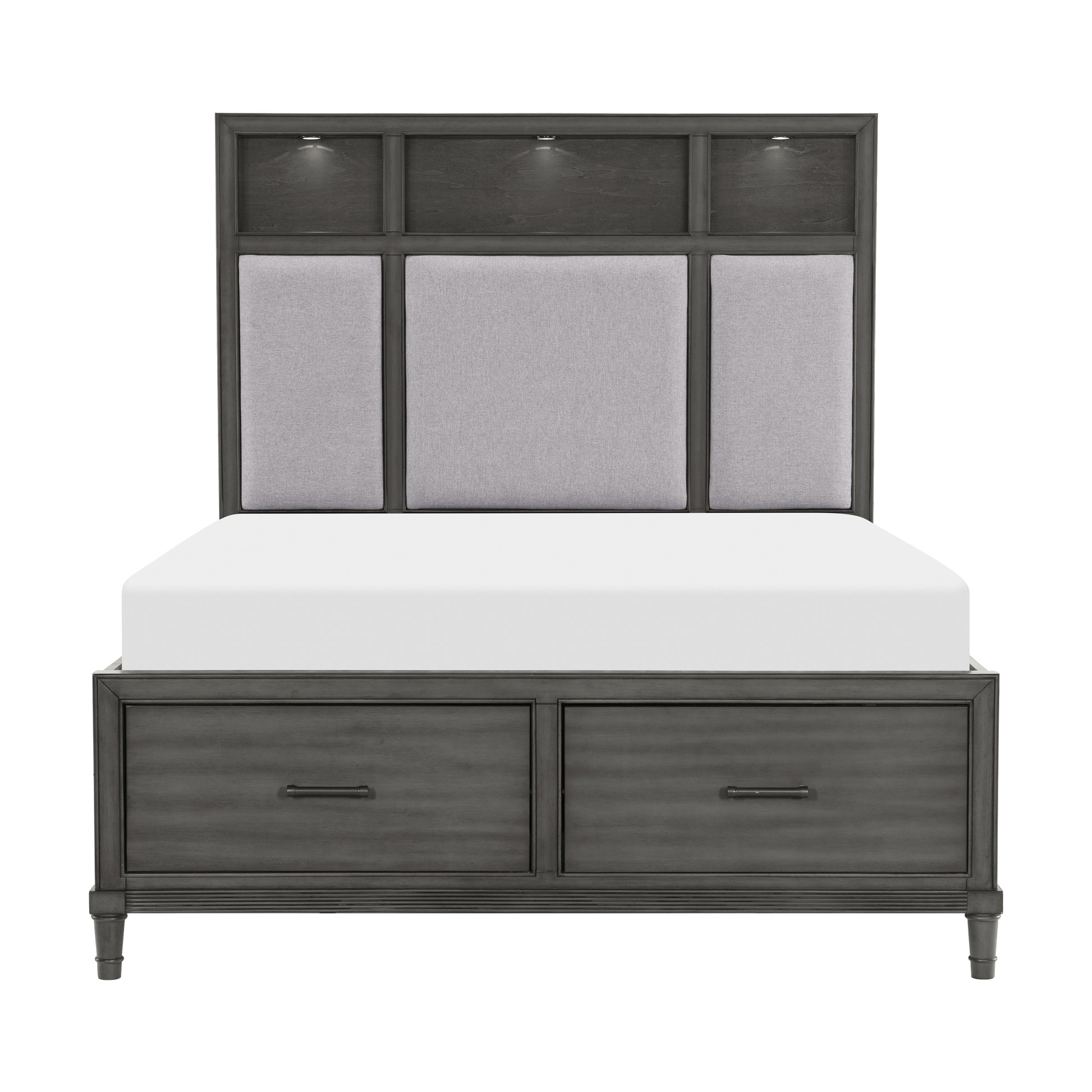 - Fabric upholstered headboard with storage cubes, USB charging ports and LED lighting