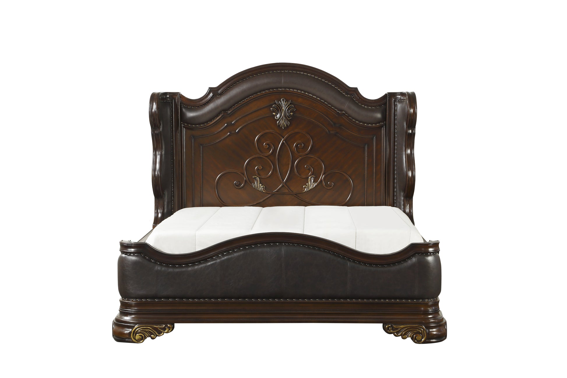 Grandly styled for the traditional home is the Royal Highlands Collection. Prominent decorative scrolling adorns the headboard while heavier, carved scrolling accents the pilasters and feet of each piece in the collection. The substantial wood framing of the bed creates a distinct serpentine profile that carries into the design of the case pieces. Brown faux leather provides complementing contrast to the rich cherry finish. Traditional cherry and birch veneers accenting furthers the elegant presentation of the Royal Highlands Collection.