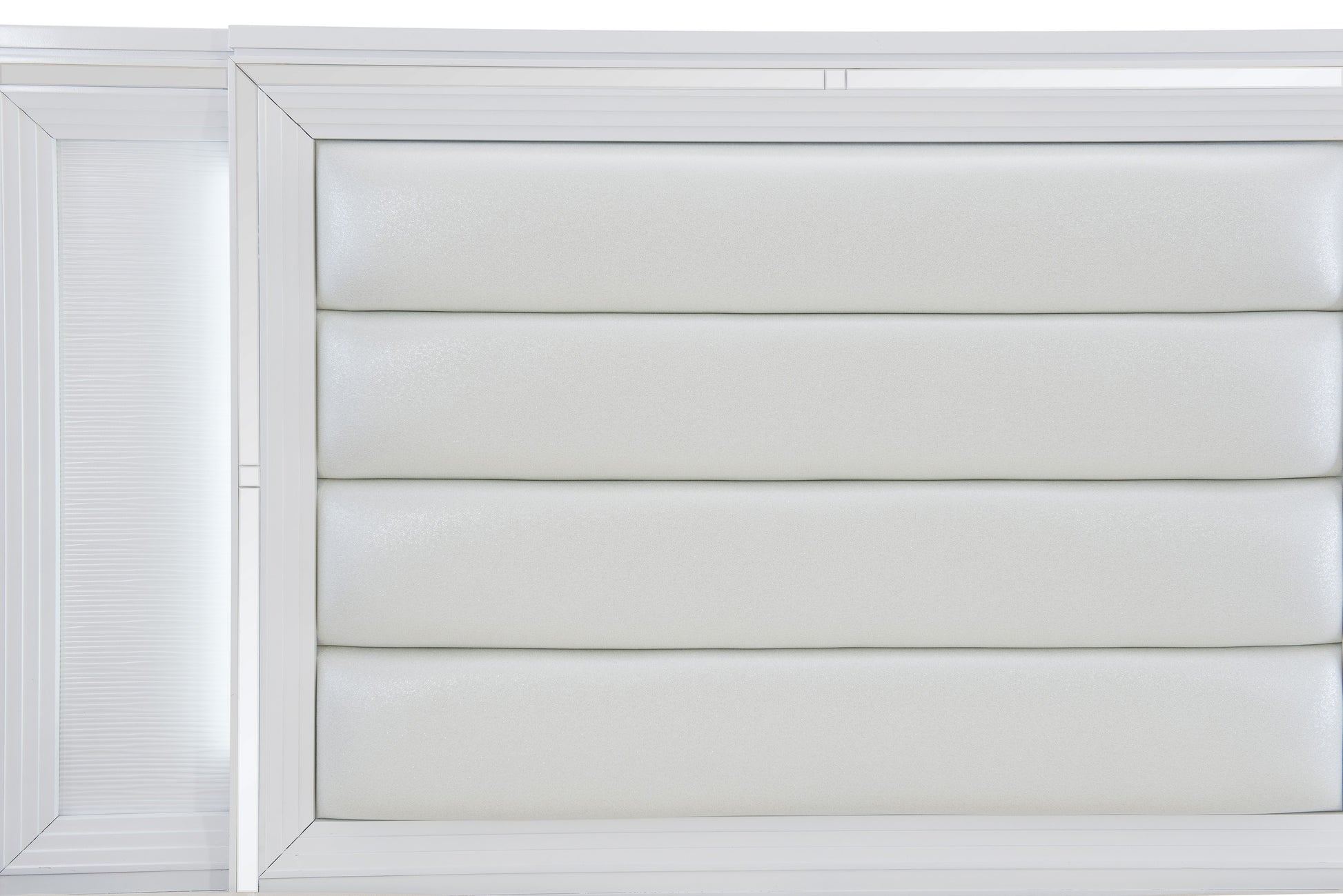 Designed to help your bedroom reach its full glamorous potential, the Tamsin Collection’s unique attributes blend to create a stylish and functional addition to your lifestyle. Mirrored framing provides dramatic enhancement to the queen bed, while LED back-lighting, from the vertical headboard panels, illuminates and highlights the embossed white finish of the collection. Acrylic bar hardware provides unobtrusive decorative touch to the drawer fronts of the storage footboard, with the faux leather-covered padded headboard insert lending decorative contrast to the finish of the collection.
