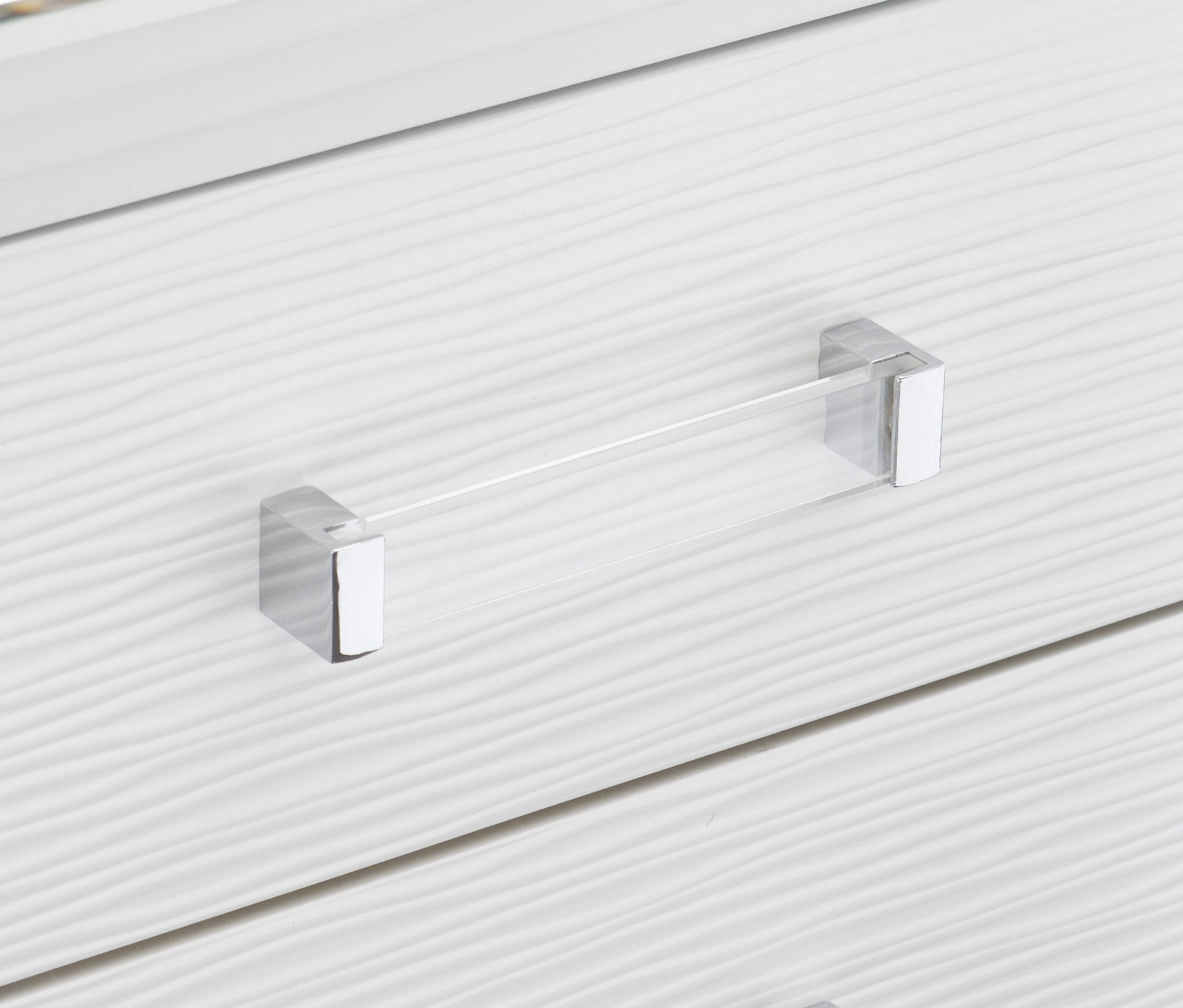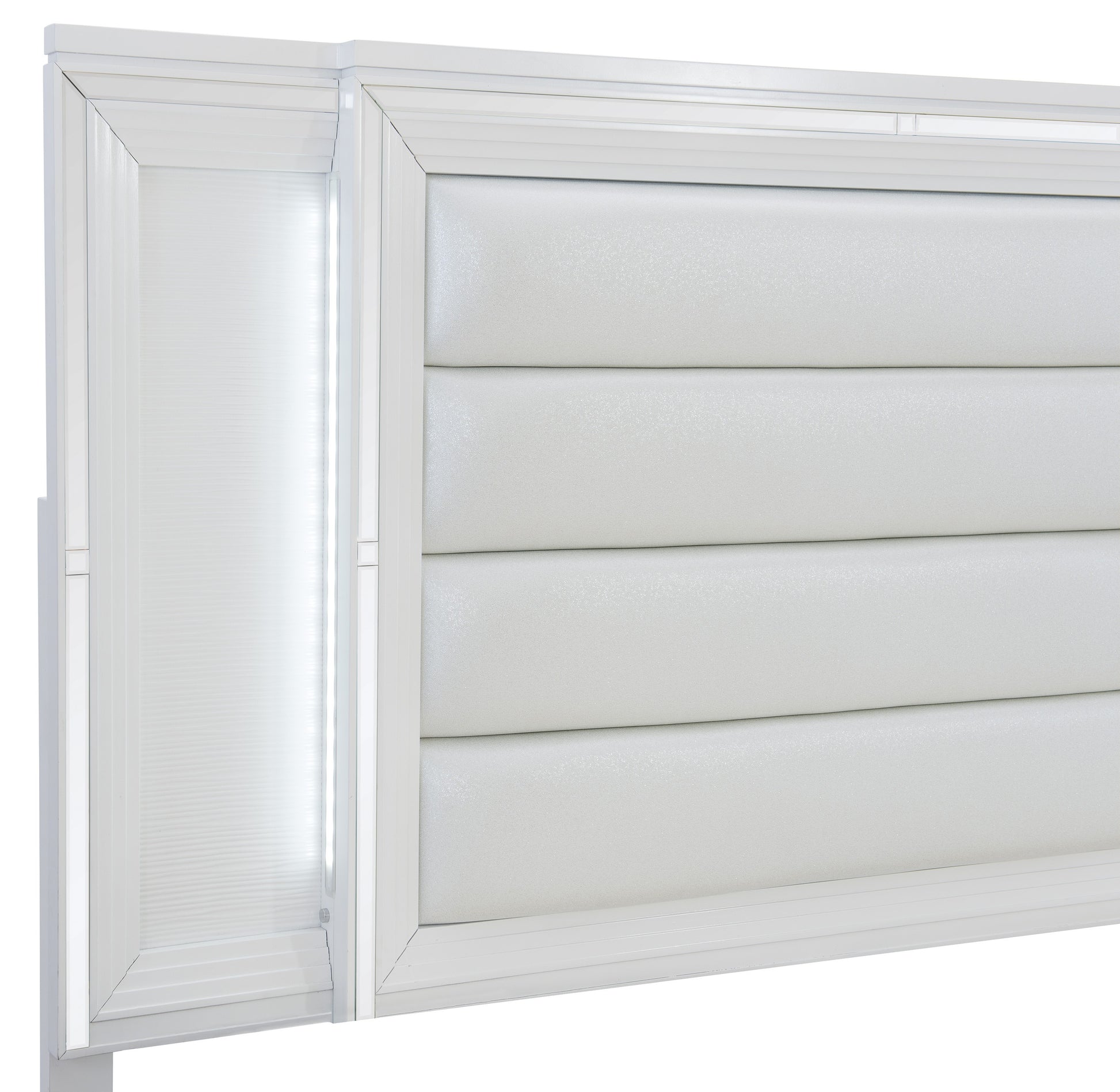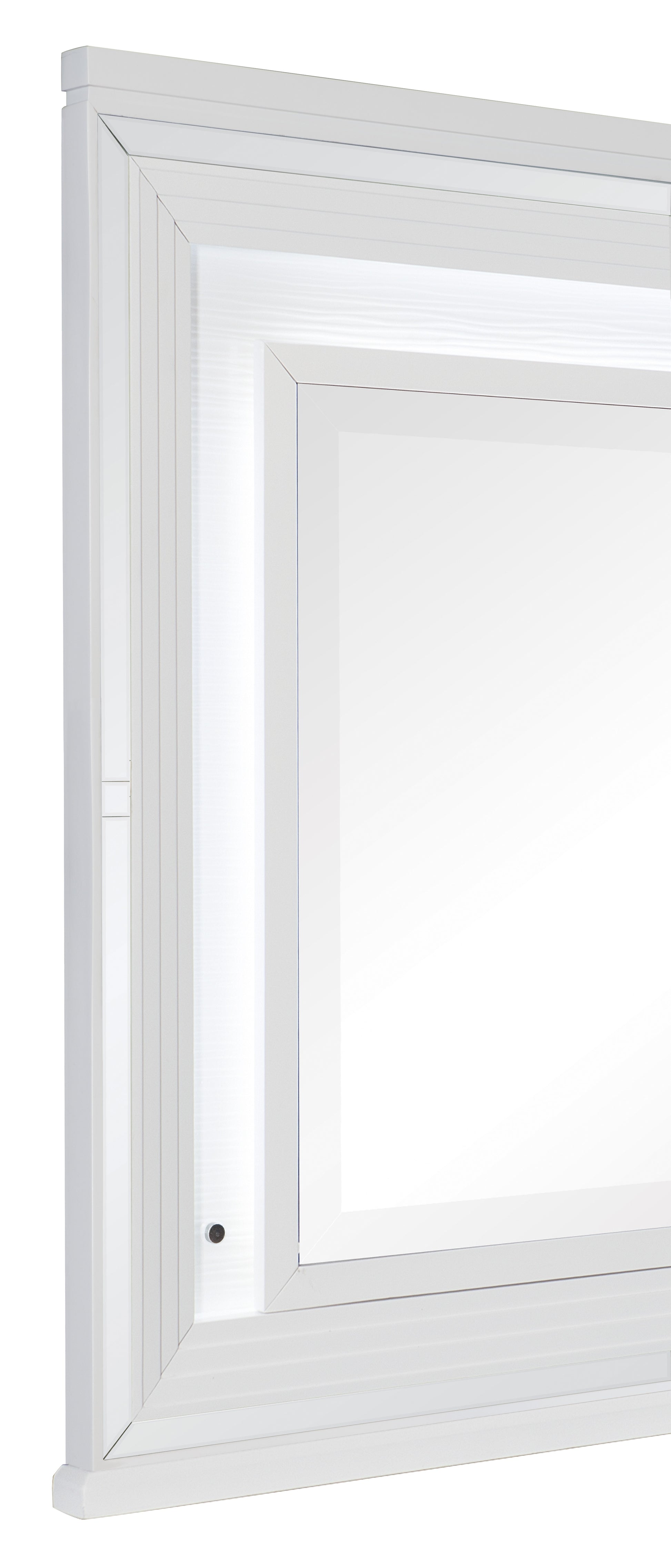 Designed to help your bedroom reach its full glamorous potential, the Tamsin Collection’s unique attributes blend to create a stylish and functional addition to your lifestyle. Mirrored framing provides dramatic enhancement to each piece in the collection, while LED back-lighting, from the vertical headboard panels and mirror, illuminates and highlights the white finish of the collection. Acrylic hardware provides unobtrusive decorative touch to the drawer fronts of the case pieces and storage footboard, with the faux leather-covered padded headboard insert lending decorative contrast to the finish of the collection. Hidden jewelry drawers in the dresser create discreet storage space for your fancy accoutrements. Also providing functional display to the collection is the available vanity. The mirrored front paired with drawer storage creates the perfect platform to prepare your glamorous self.