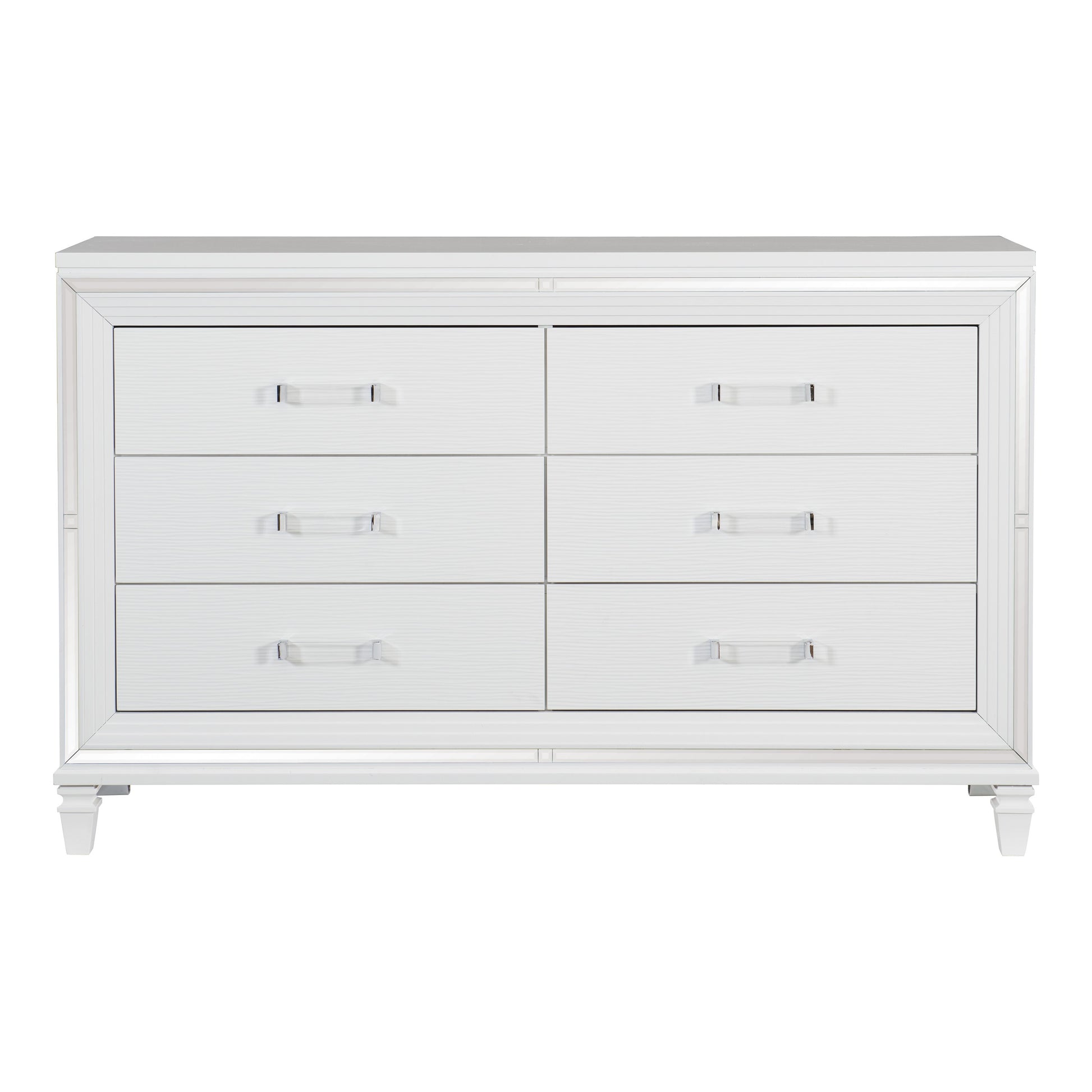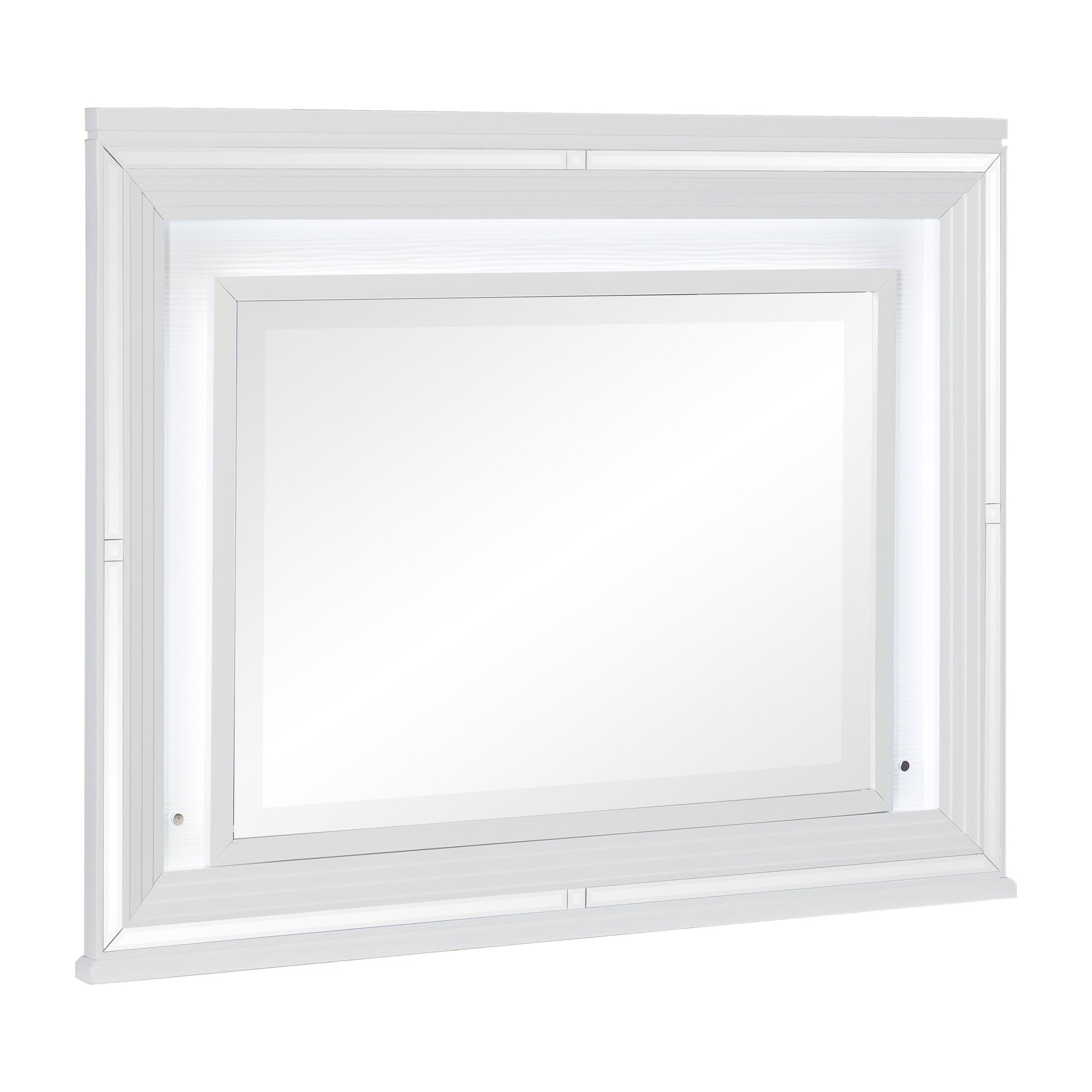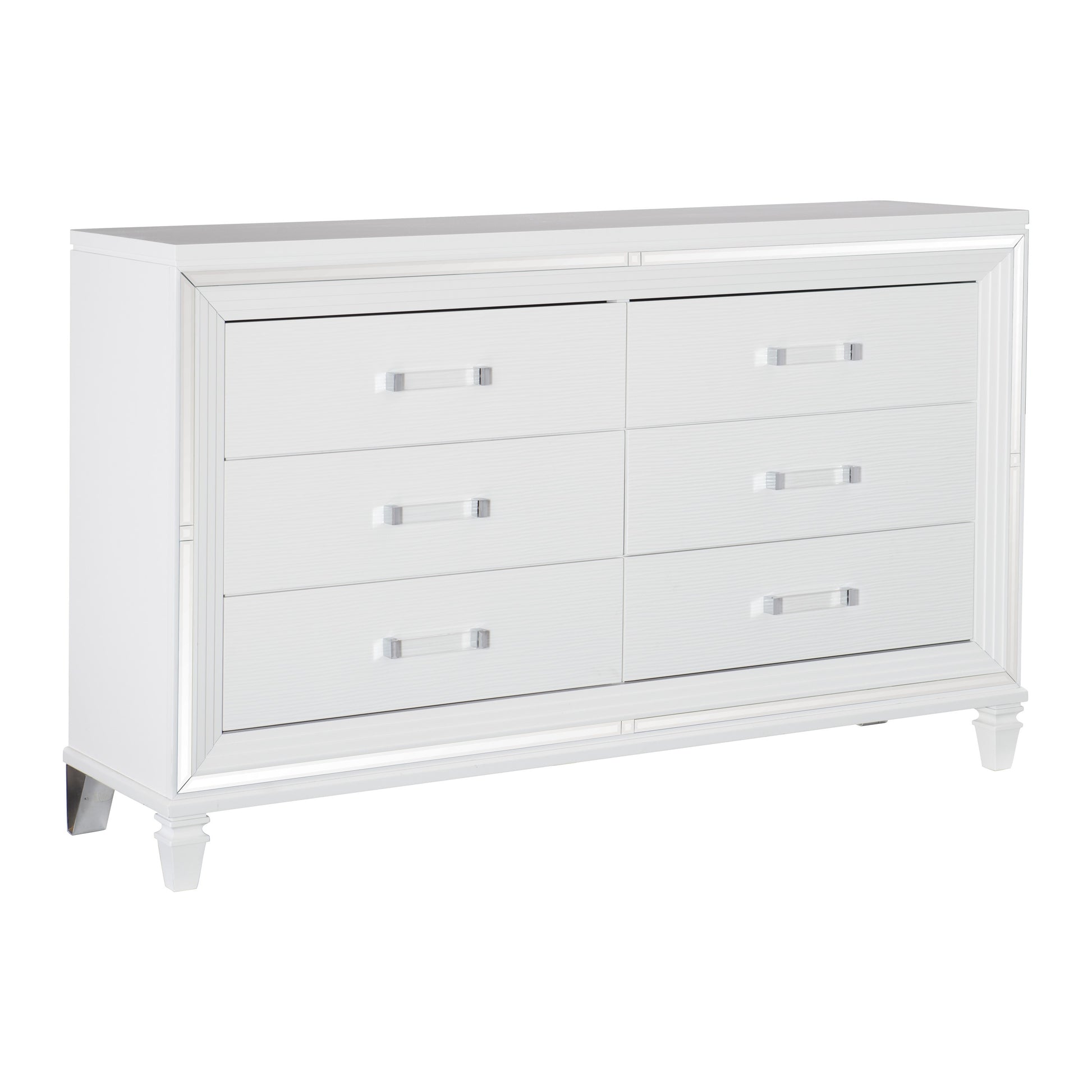 Designed to help your bedroom reach its full glamorous potential, the Tamsin Collection’s unique attributes blend to create a stylish and functional addition to your lifestyle. Mirrored framing provides dramatic enhancement to each piece in the collection, while LED back-lighting, from the vertical headboard panels and mirror, illuminates and highlights the white finish of the collection. Acrylic hardware provides unobtrusive decorative touch to the drawer fronts of the case pieces and storage footboard, with the faux leather-covered padded headboard insert lending decorative contrast to the finish of the collection. Hidden jewelry drawers in the dresser create discreet storage space for your fancy accoutrements. Also providing functional display to the collection is the available vanity. The mirrored front paired with drawer storage creates the perfect platform to prepare your glamorous self.