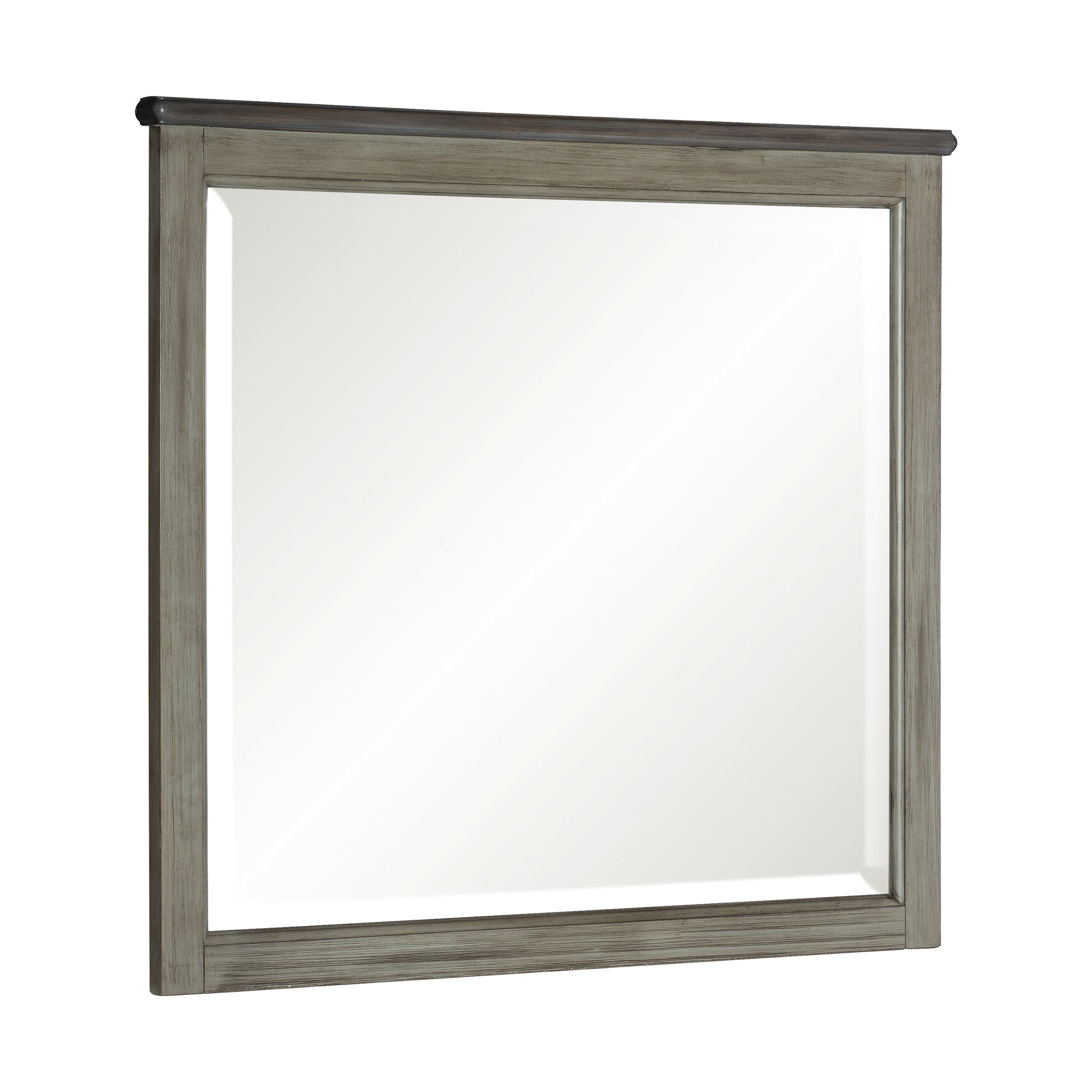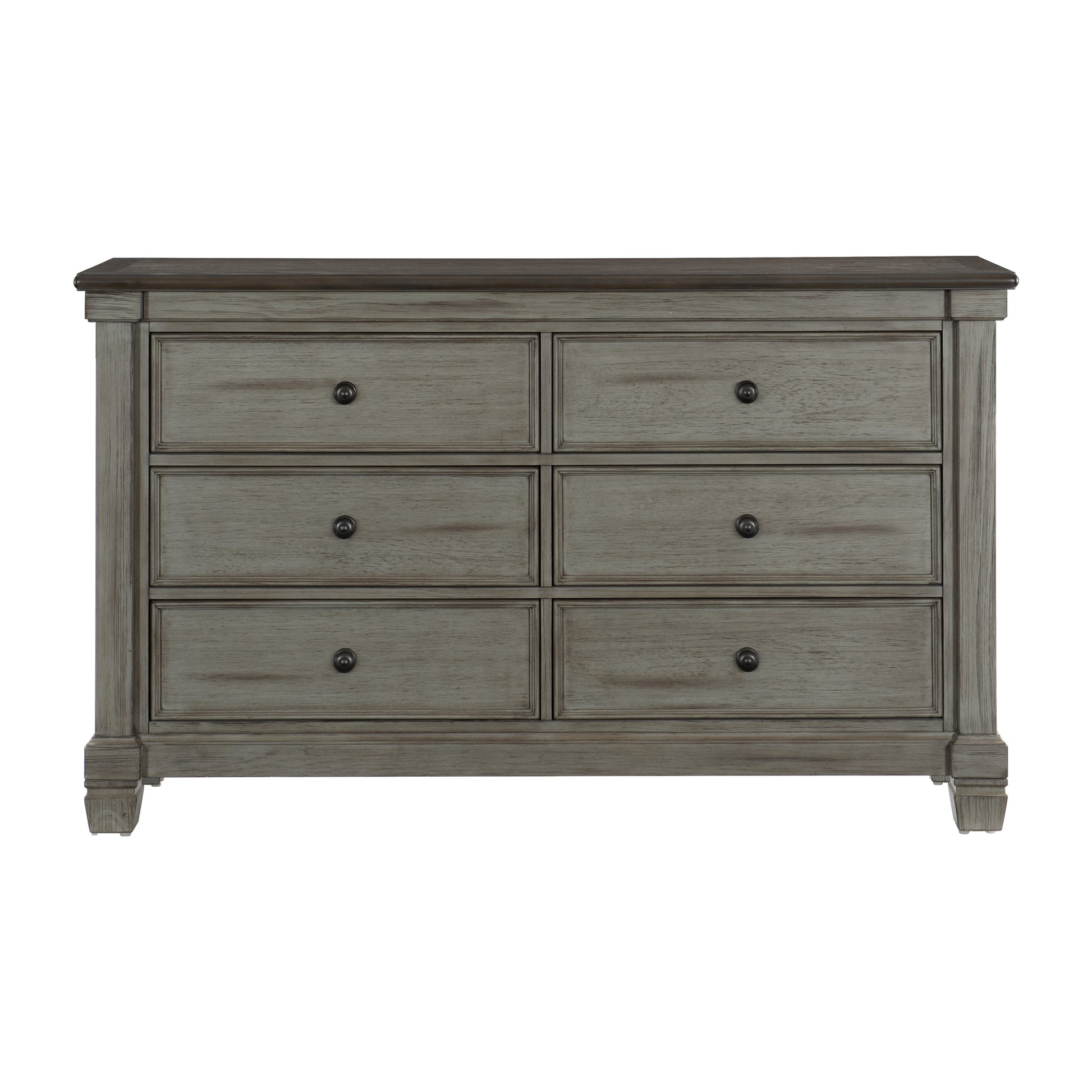 Transitional-rustic styling is expertly achieved in the design of the Weaver Collection. Antique gray provides bold contrast to the coffee-hued plank-style tops, with pine solids and oak veneer further lending visual texture to the bedroom. Classic framing paired with dark metal knob hardware complete the rustic look.