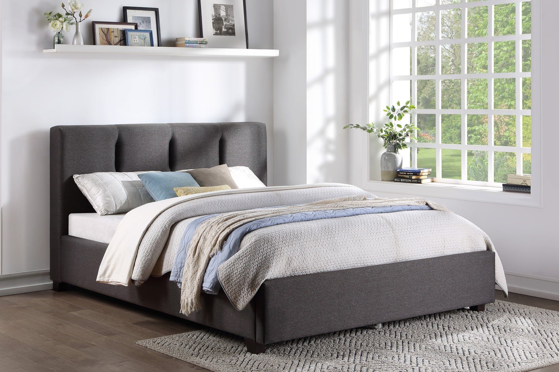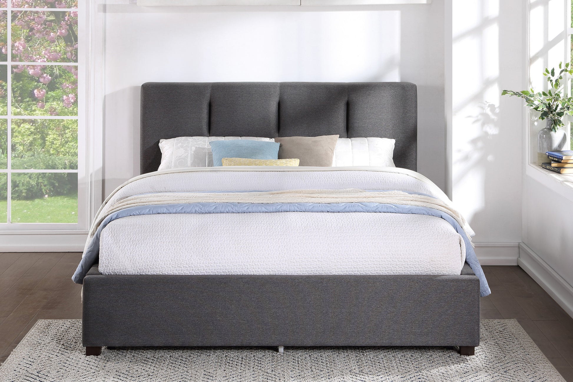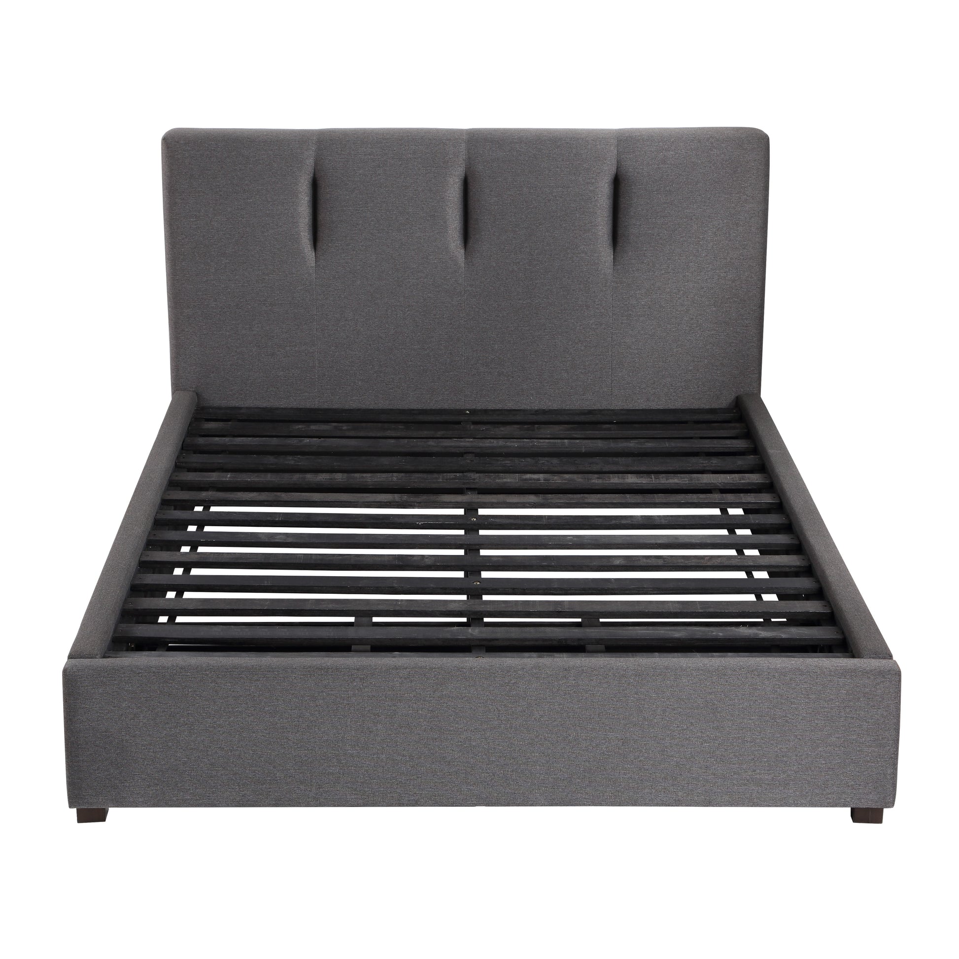 The streamlined design of the Aitana Collection provides a functional focal point for your bedroom. With styling that lends to placement in modern environments, the upholstered bed’s profile is defined by its low-profile and graphite-hued linen-like fabric for neutral accent to your bedroom’s modern decor. The queen platform system is supported by the low-profile footboard and rails.