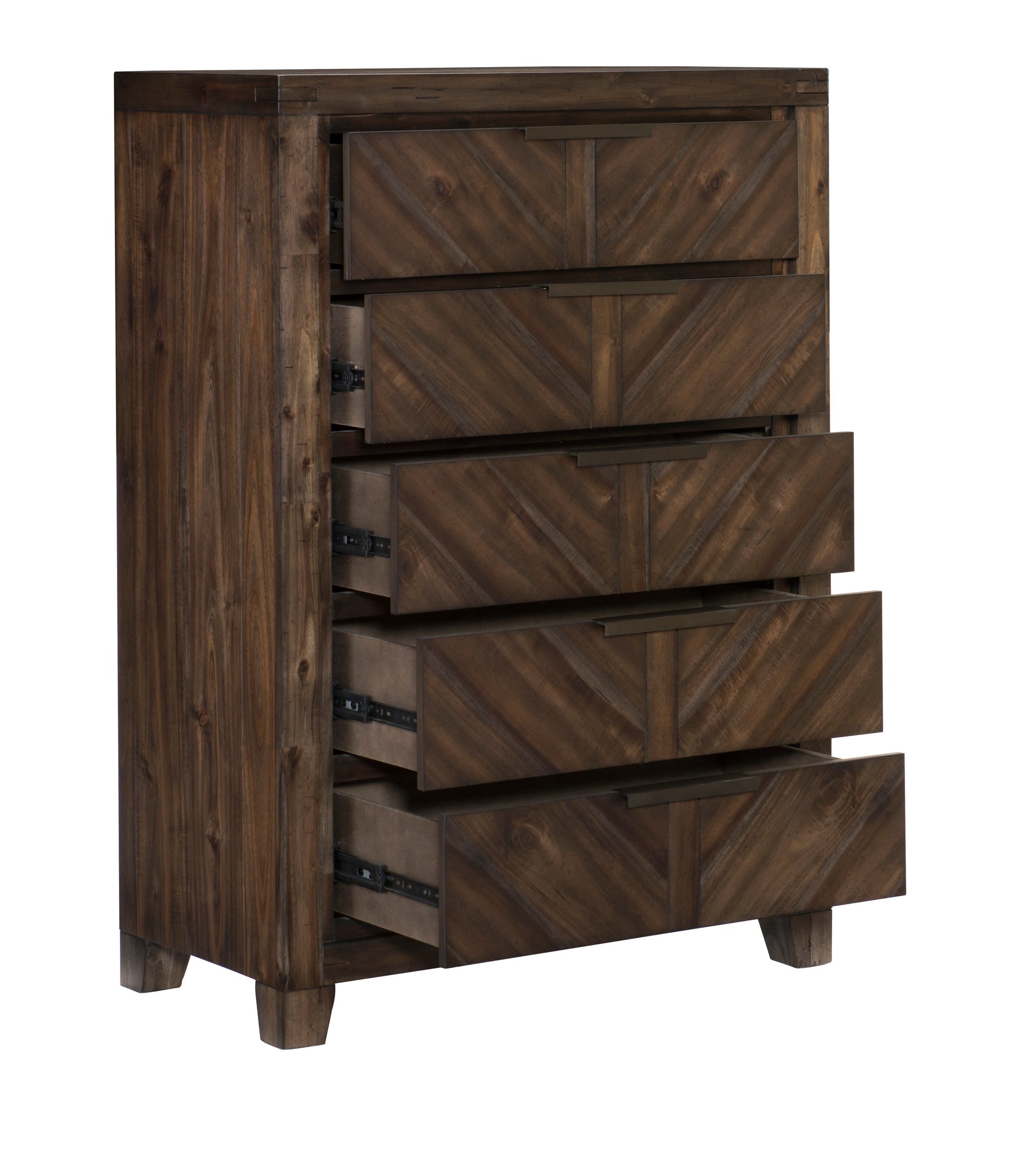 Inspired by the aesthetic of modern-rustic design, the Parnell Collection utilized bold enhancement to create the perfect addition to your bedroom. V-matched planks draw immediate attention to their visually stunning shape and distressed espresso finish, over acacia veneers, that graces the collection. Mounted at the top of each chest drawer are antiqued finished pull hardware which enhance the rustic vision. Bold, yet understated, framing defines the collection’s modern profile.