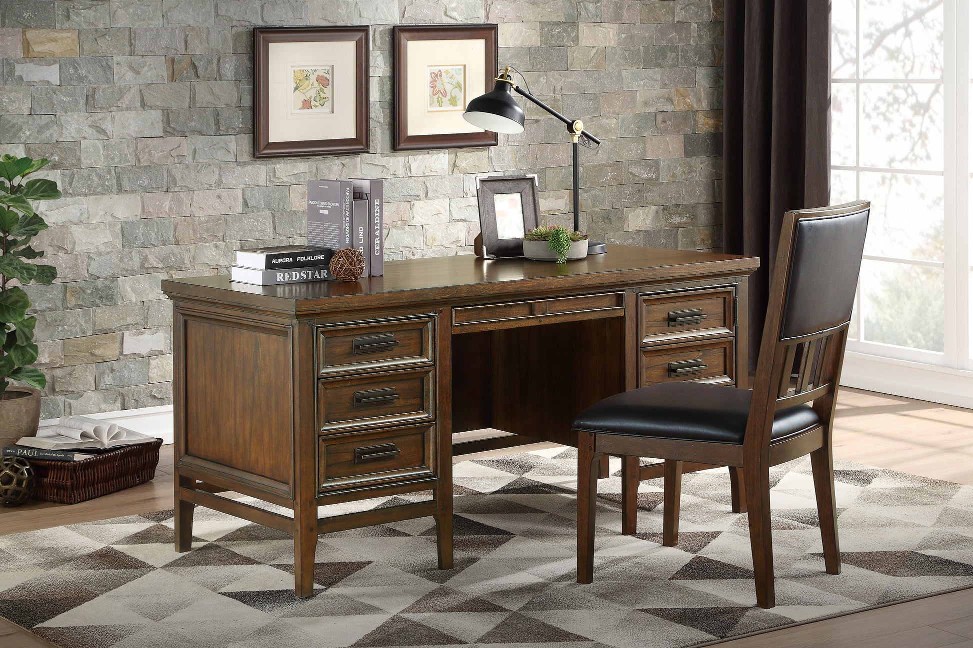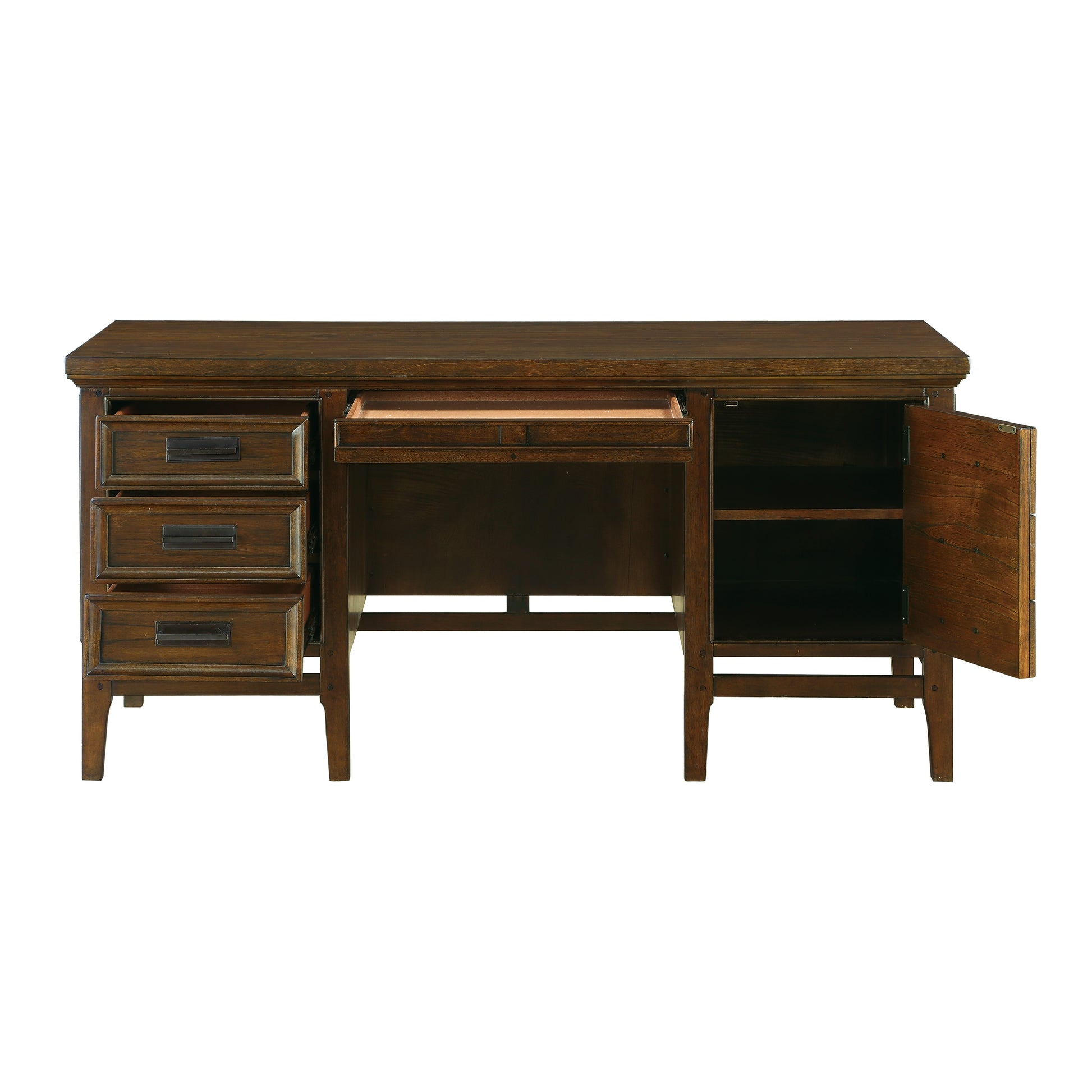 With a subtle lodge look that takes inspiration from design history, the classic styling of the Frazier Park Collection will help you create a home office environment that is a reflection of your preference for traditional spaces. The brown cherry finish that highlights the mindy veneer provides rich character to the wood’s grain. Horizontal fixed knob hardware fronts the functional drawers and doors of the executive desk creating subtle contrast to the collection’s finish. The executive desk provides ample tabletop - with keyboard tray - for your big projects while allowing for drawer and behind door storage to keep your office necessities out of sight. Writing desk and bookcase are also available.