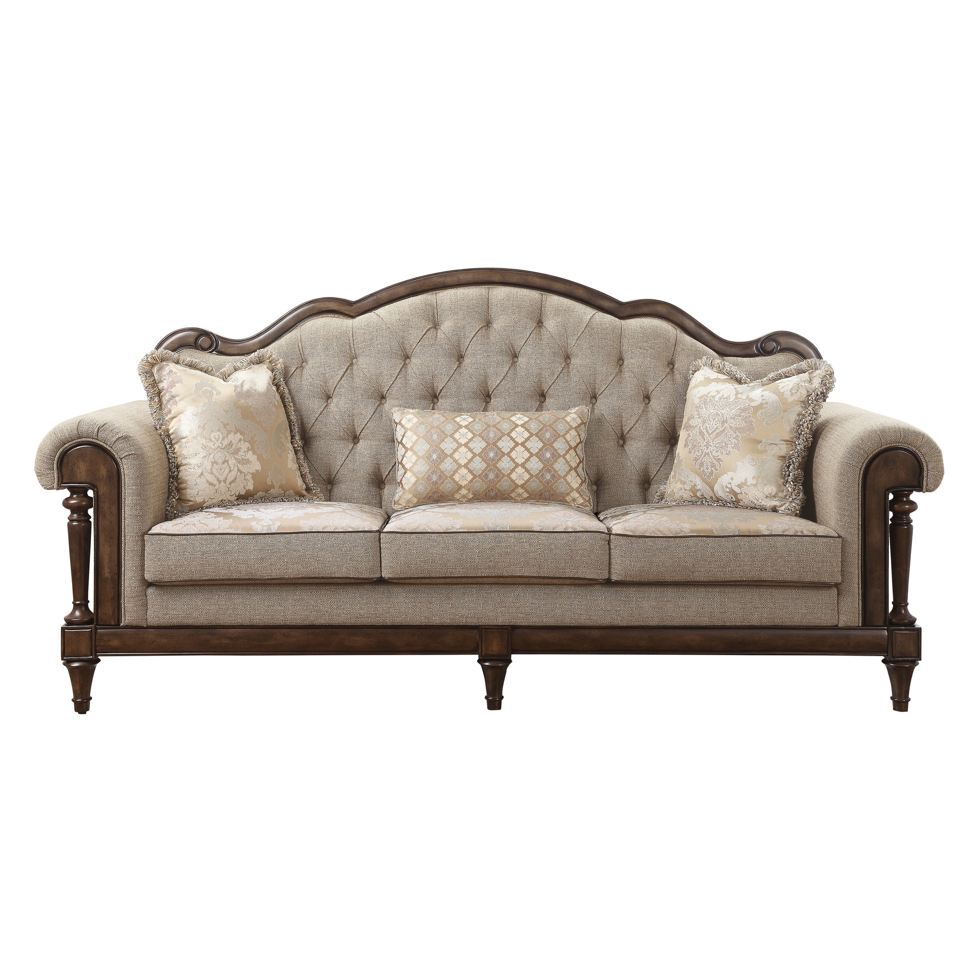The elegant profile of the Heath Court Collection is comprised of classic elements that have been combined to create the perfect addition to your home’s traditional décor. The neutral hued brown fabric sets the tone for the refined presentation with chenille seat tops, coordinating toss pillows, button tufting and welting lending complementing accent to the set. The show-wood frame features white oak veneer with a brown finish that complements the fabric cover. The dramatic camelback profile is enhanced by the rolled arms and turned pilaster fronts.