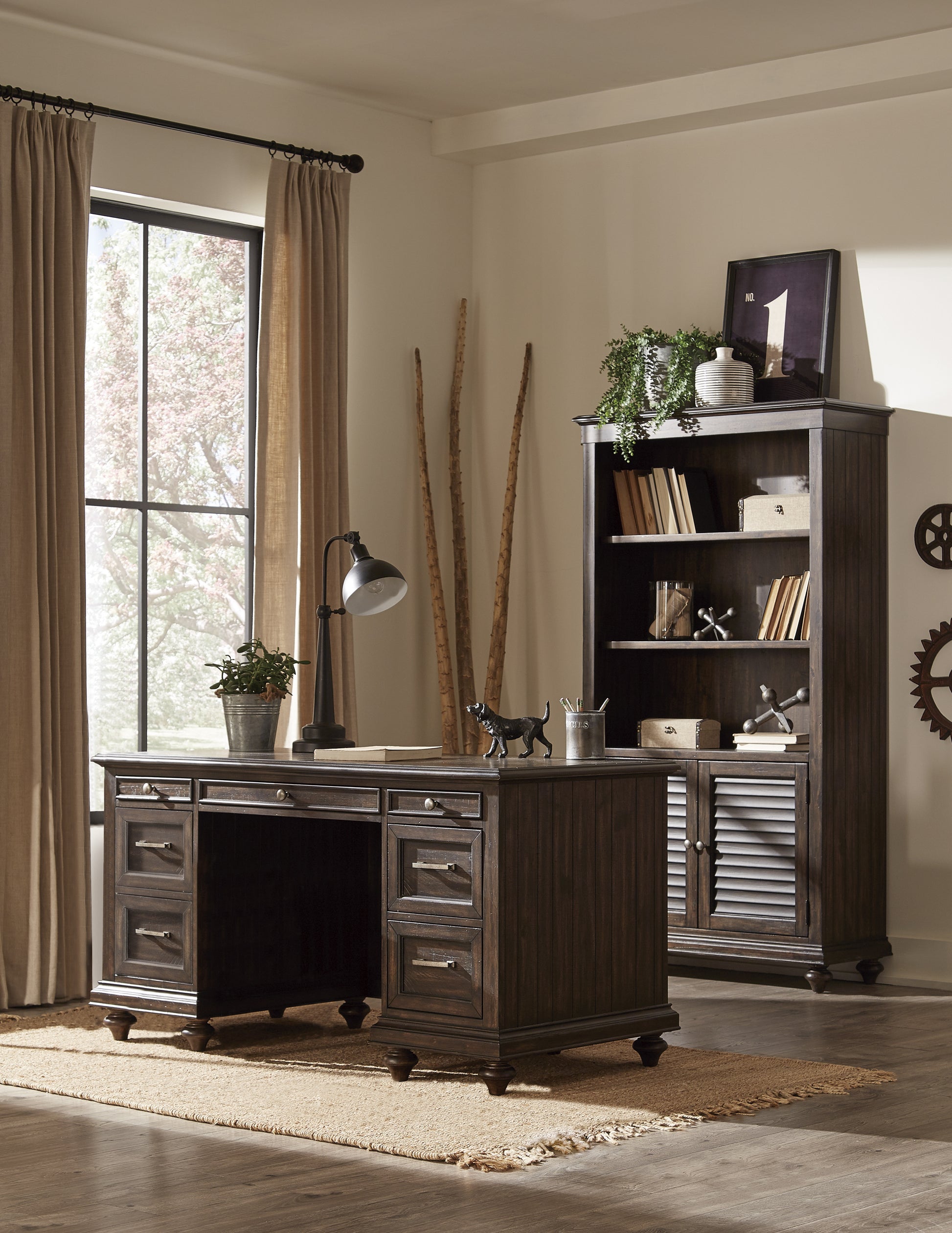 The solid transitional styling of the Cardano Collection creates an impactful design presence in your home. Utilizing distinct accent techniques – plank effect, rasping, saw marks – and pairing them with traditional framing and a rich finish – driftwood charcoal over acacia veneers – creates a bookcase that is worthy of your home. Pewter-finished hardware, mounted on the functional doors, provides a subtle contrast to the wood’s dark finish. Executive desk and writing desk are also available.