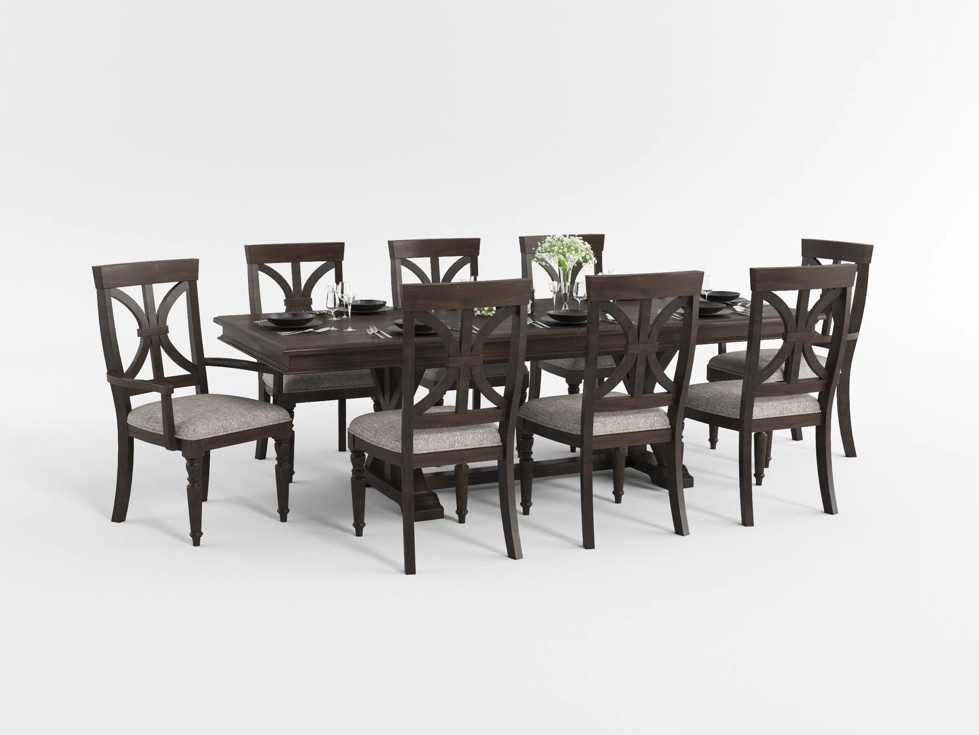 The solid transitional styling of the Cardano Collection creates an impactful design presence in your dining room. Utilizing distinct accent techniques – plank effect, rasping, saw marks – and pairing them with traditional framing and a light finish – brown wood over acacia veneers – creates a collection that is worthy of your dining room. The 96-inch rectangular table tables allow for perfect placement within your space. The tabletop expands to its full length with the addition of the dual extension leaves. An x-framed double pedestal trestle base supports the tabletop.