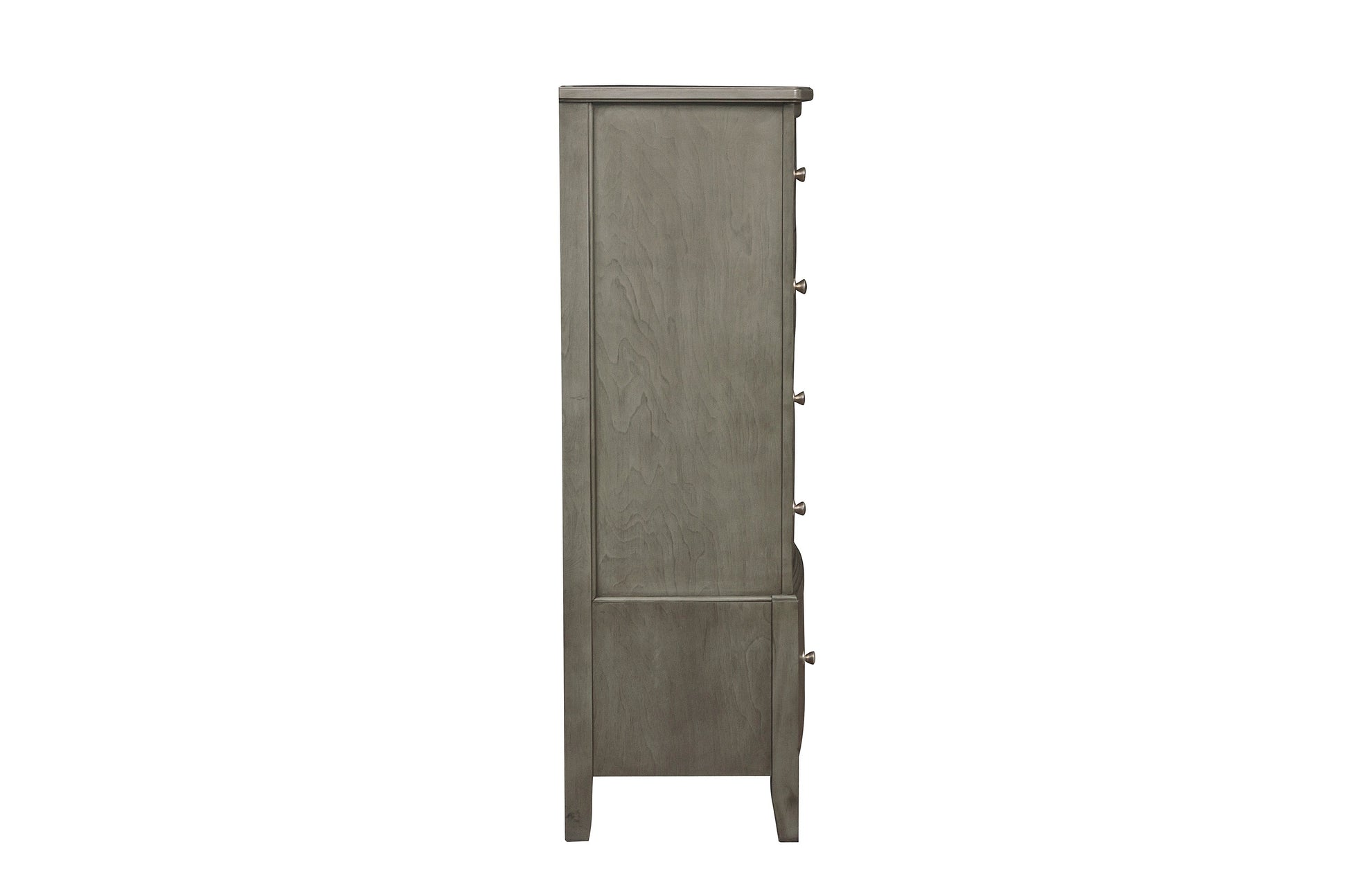 With transitional styling that is at home in a number of decorative environments, the Cotterill Collection will be a versatile addition to your bedroom. The chest’s gray finish, over birch veneer, dramatically enhances the wood’s grain and is perfectly accented by the nickel hardware that punctuates each drawer front.